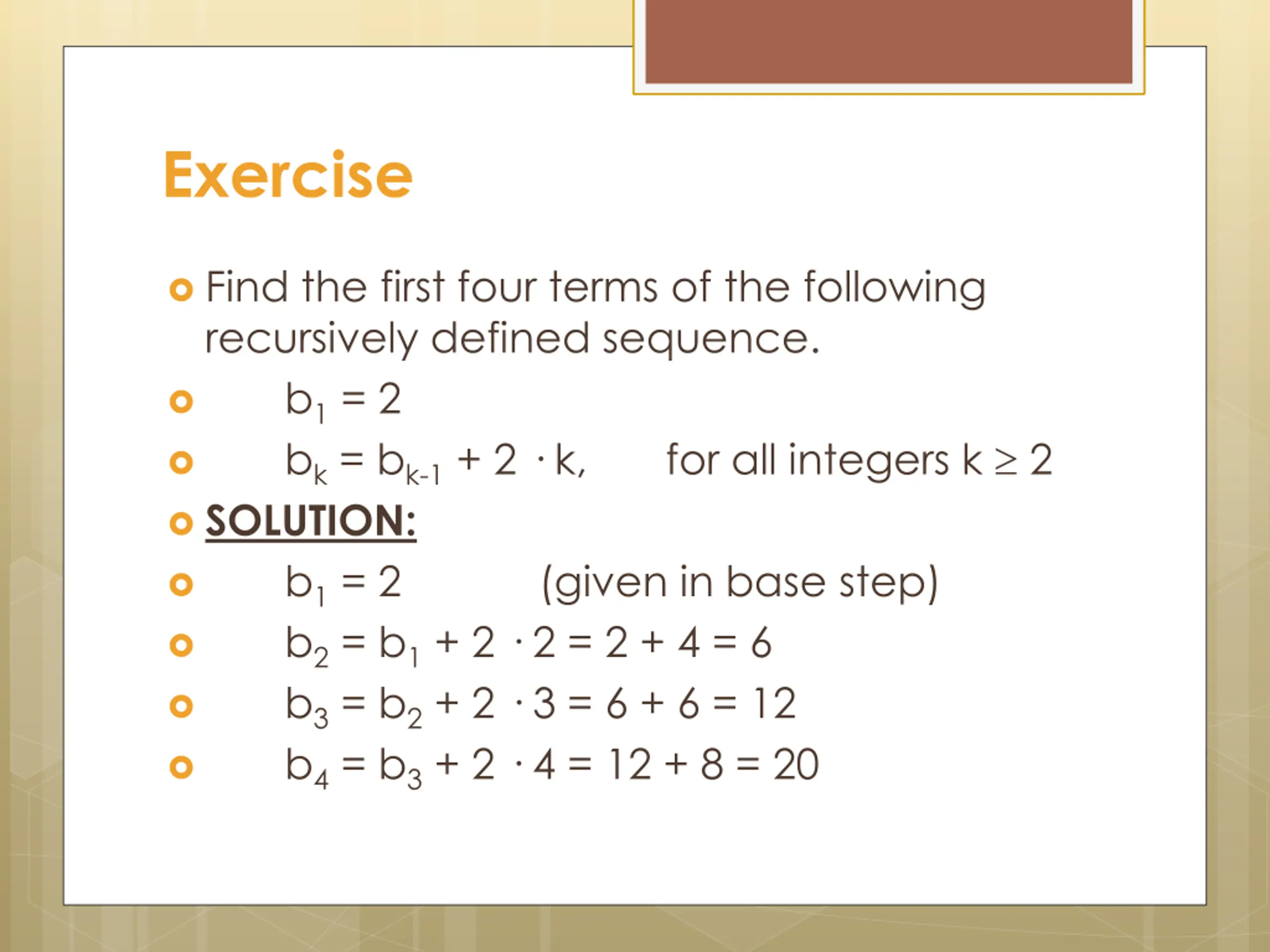 Exercise Find the first four terms of the following recursively defined sequence. b1= 2 bk= bk-1+ 2 k, SOLUTION: b1= 2 (given in base step) b2= b1+ 2 2 = 2 + 4 = 6 b3= b2+ 2 3 = 6 + 6 = 12 b4= b3+ 2 4 = 12 + 8 = 20 for all integers k 2