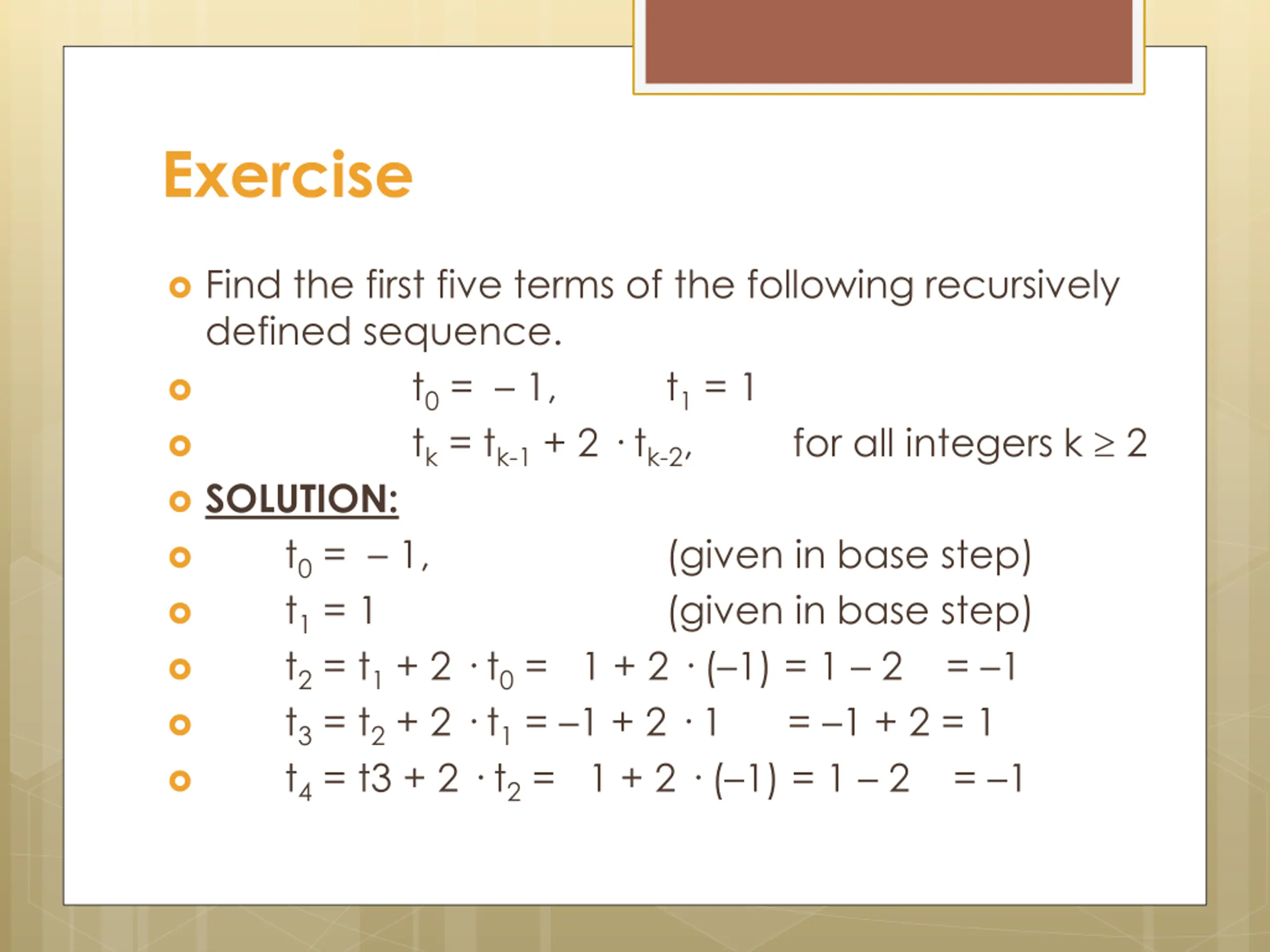 Exercise Find the first five terms of the following recursively defined sequence. t0= 1, tk= tk-1+ 2 tk-2, SOLUTION: t0= 1, t1= 1 t2= t1+ 2 t0= 1 + 2 ( 1) = 1 2 = 1 t3= t2+ 2 t1= 1 + 2 1 = 1 + 2 = 1 t4= t3 + 2 t2= 1 + 2 ( 1) = 1 2 = 1 t1= 1 for all integers k 2 (given in base step) (given in base step)