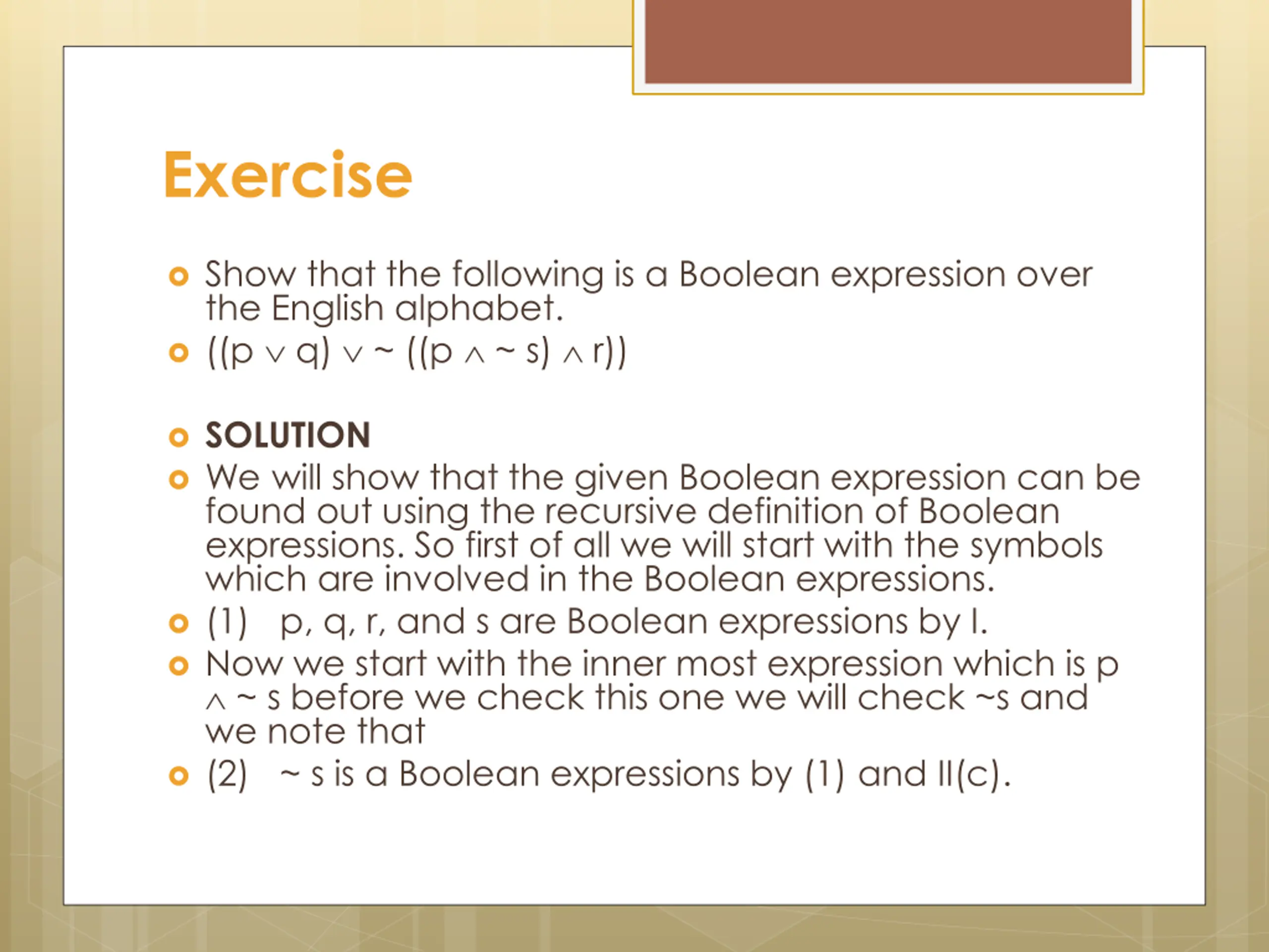 Exercise Show that the following is a Boolean expression over the English alphabet. ((p q) ~ ((p ~ s) r)) SOLUTION We will show that the given Boolean expression can be found out using the recursive definition of Boolean expressions. So first of all we will start with the symbols which are involved in the Boolean expressions. (1) p, q, r, and s are Boolean expressions by I. Now we start with the inner most expression which is p ~ s before we check this one we will check ~s and we note that (2) ~ s is a Boolean expressions by (1) and II(c).