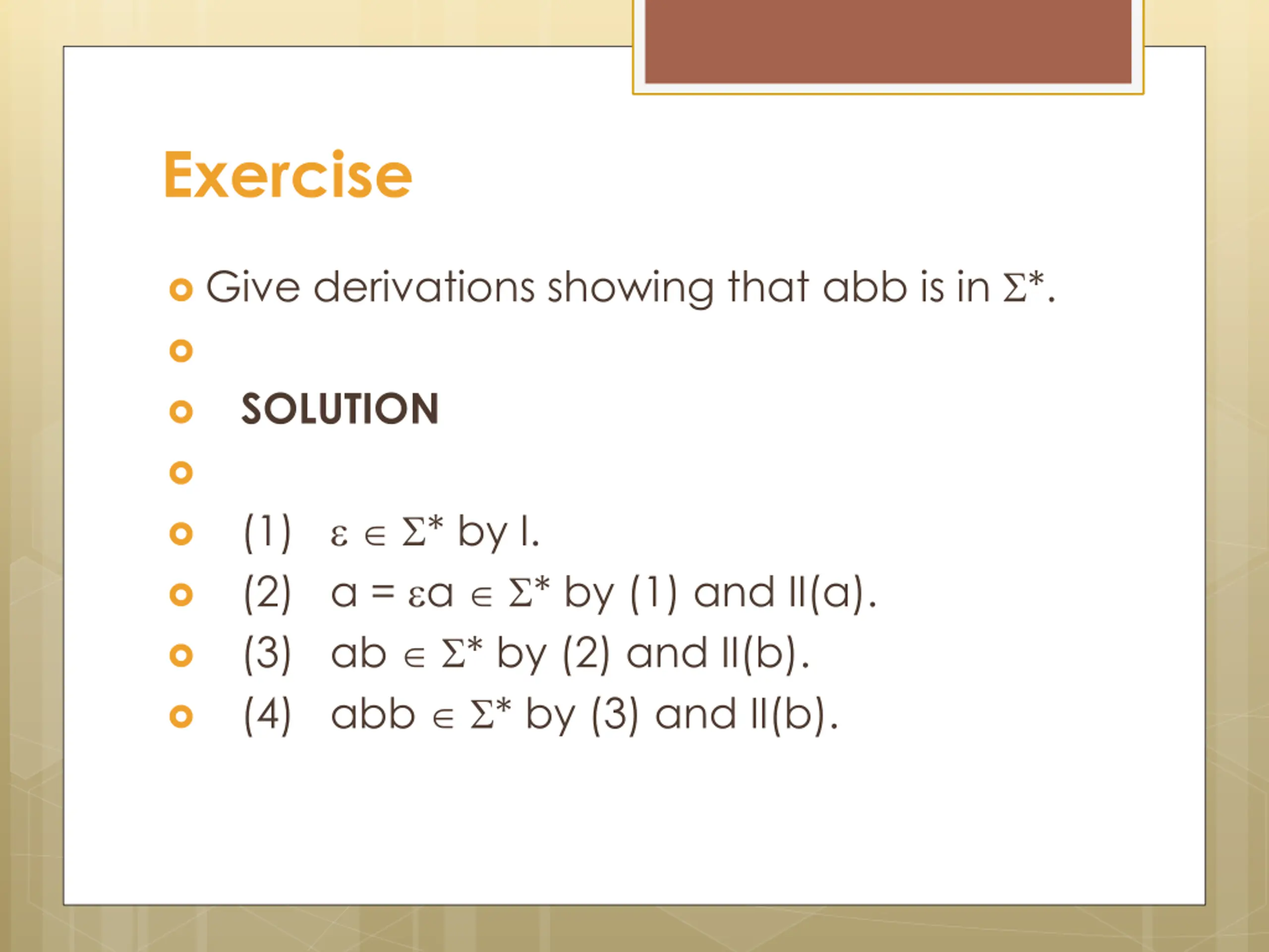 Exercise Give derivations showing that abb is in *. SOLUTION (1) * by I. (2) a = a * by (1) and II(a). (3) ab * by (2) and II(b). (4) abb * by (3) and II(b).