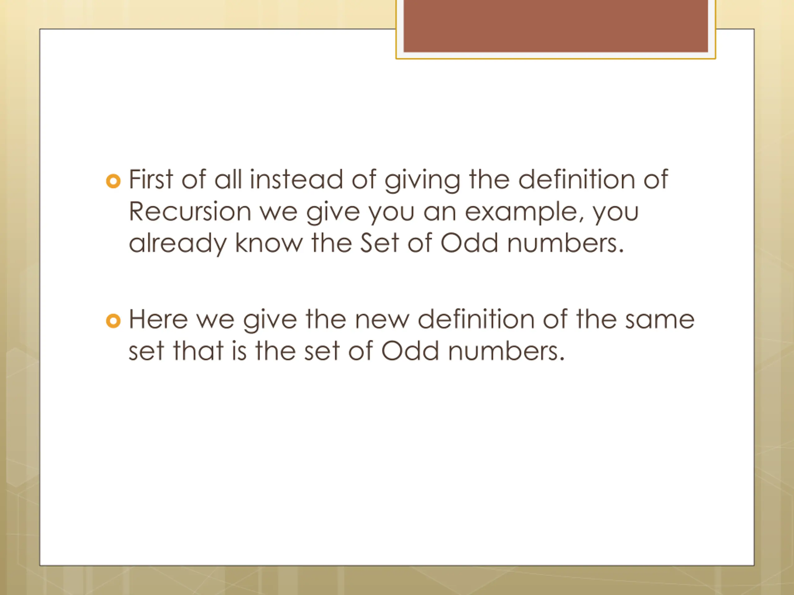 First of all instead of giving the definition of Recursion we give you an example, you already know the Set of Odd numbers. Here we give the new definition of the same set that is the set of Odd numbers.