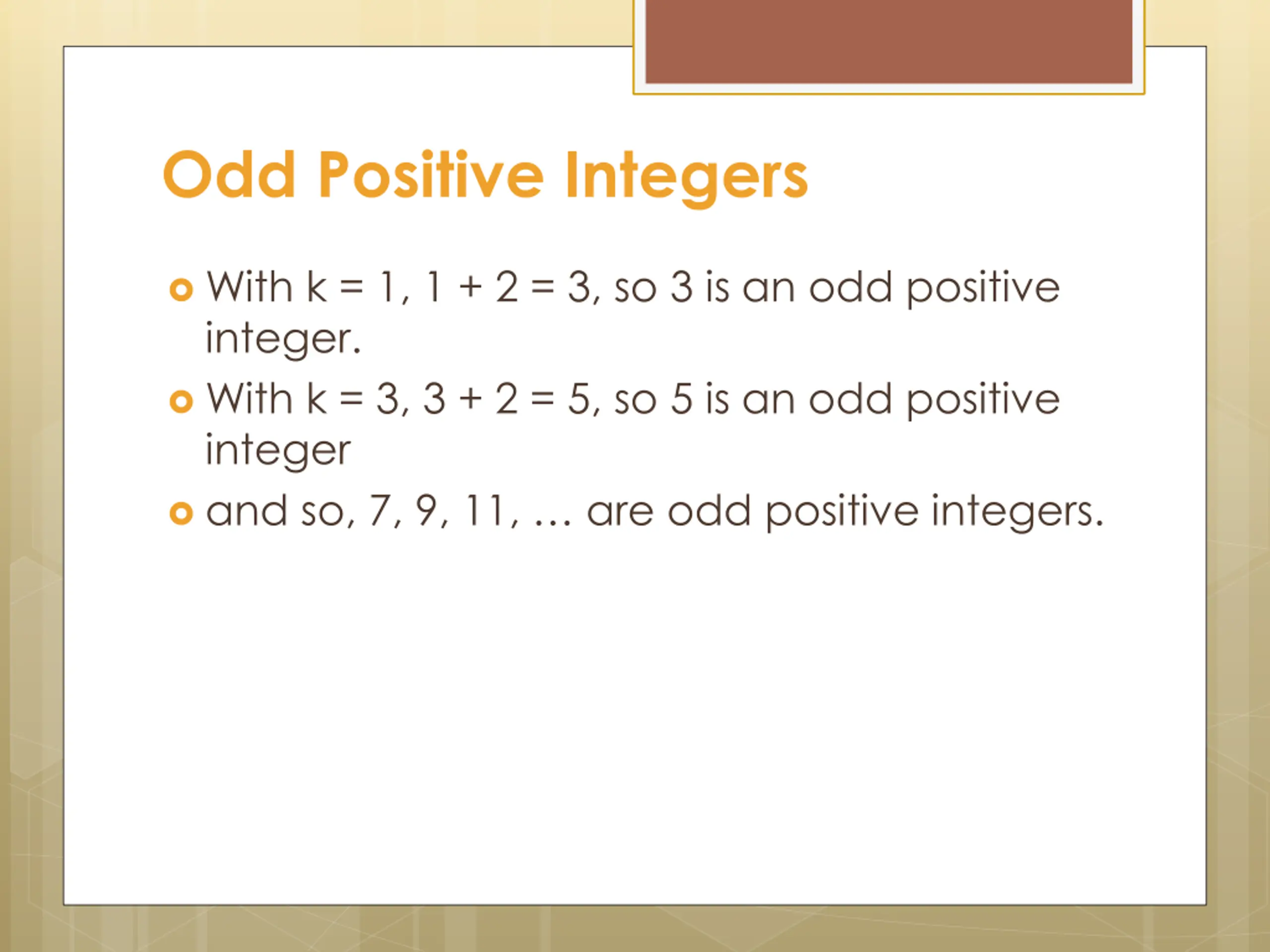 Odd Positive Integers With k = 1, 1 + 2 = 3, so 3 is an odd positive integer. With k = 3, 3 + 2 = 5, so 5 is an odd positive integer and so, 7, 9, 11, are odd positive integers.