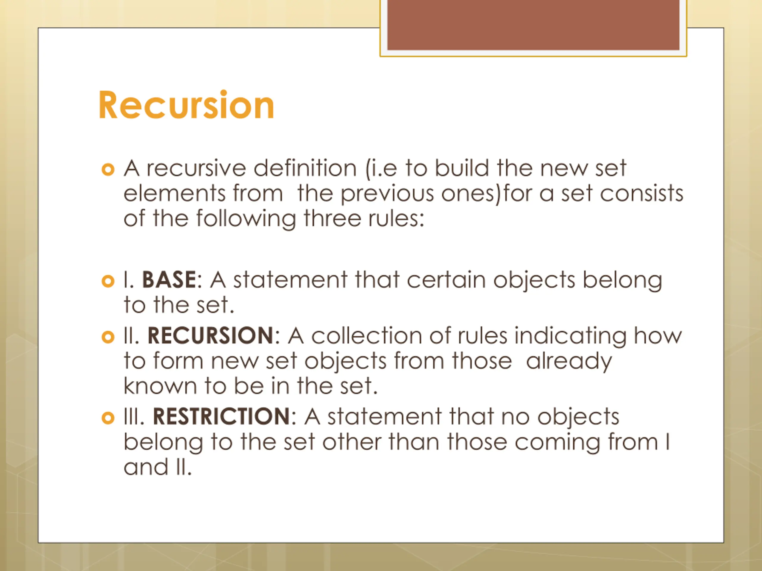 Recursion A recursive definition (i.e to build the new set elements from the previous ones)for a set consists of the following three rules: I. BASE: A statement that certain objects belong to the set. II. RECURSION: A collection of rules indicating how to form new set objects from those already known to be in the set. III. RESTRICTION: A statement that no objects belong to the set other than those coming from I and II.