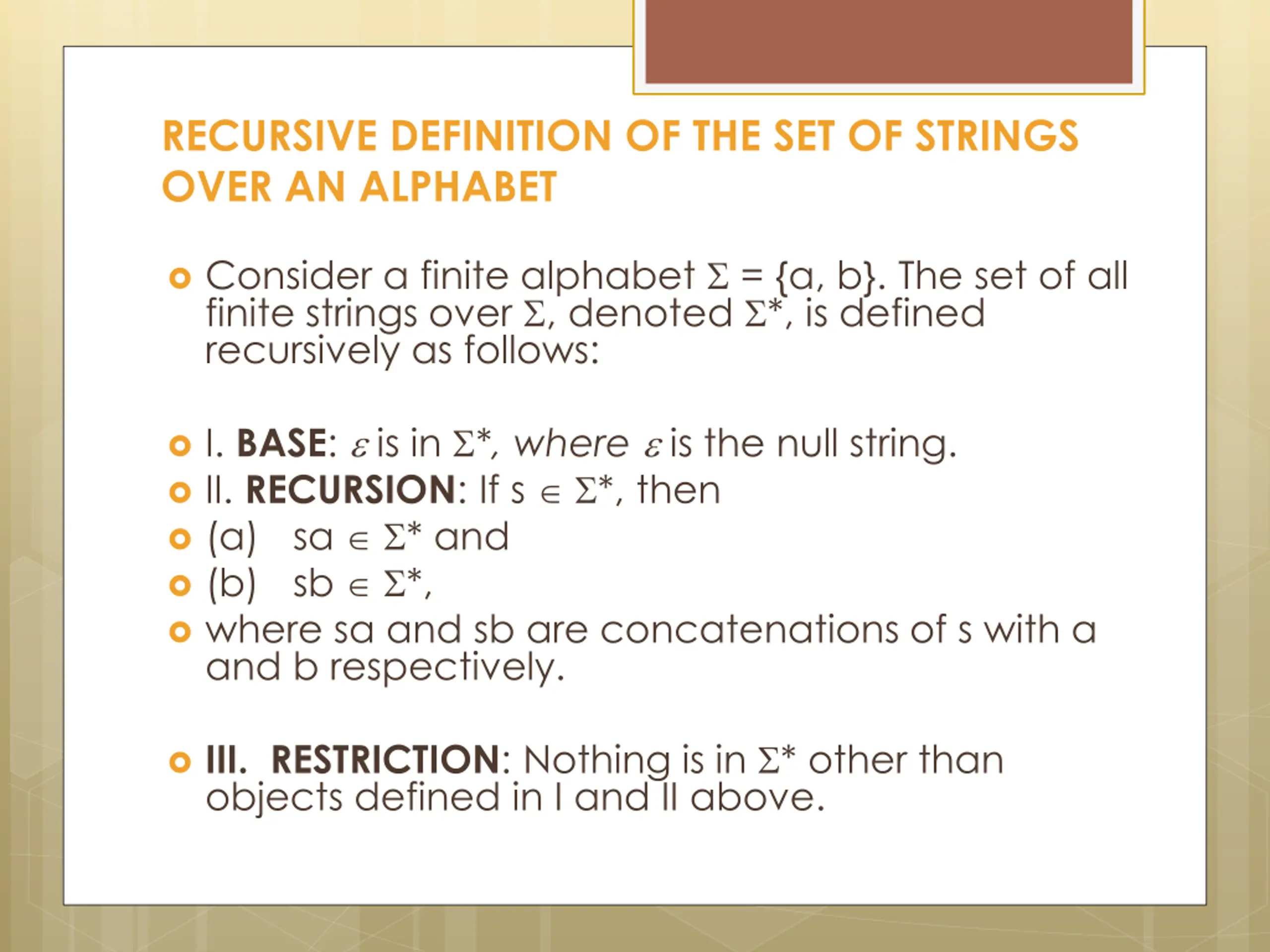 RECURSIVE DEFINITION OF THE SET OF STRINGS OVER AN ALPHABET Consider a finite alphabet = {a, b}. The set of all finite strings over , denoted *, is defined recursively as follows: I. BASE: is in *, where is the null string. II. RECURSION: If s *, then (a) sa * and (b) sb *, where sa and sb are concatenations of s with a and b respectively. III. RESTRICTION: Nothing is in * other than objects defined in I and II above.