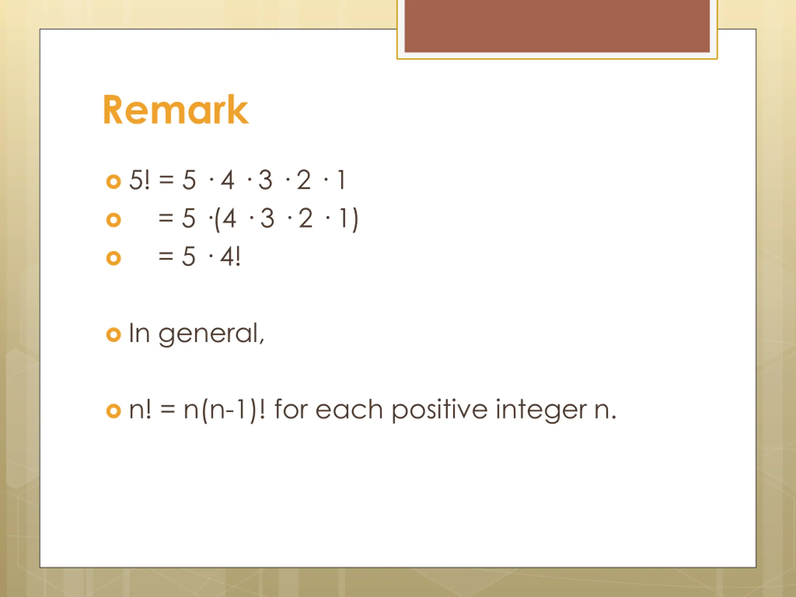 Remark 5! = 5 4 3 2 1 = 5 (4 3 2 1) = 5 4! In general, n! = n(n-1)! for each positive integer n.