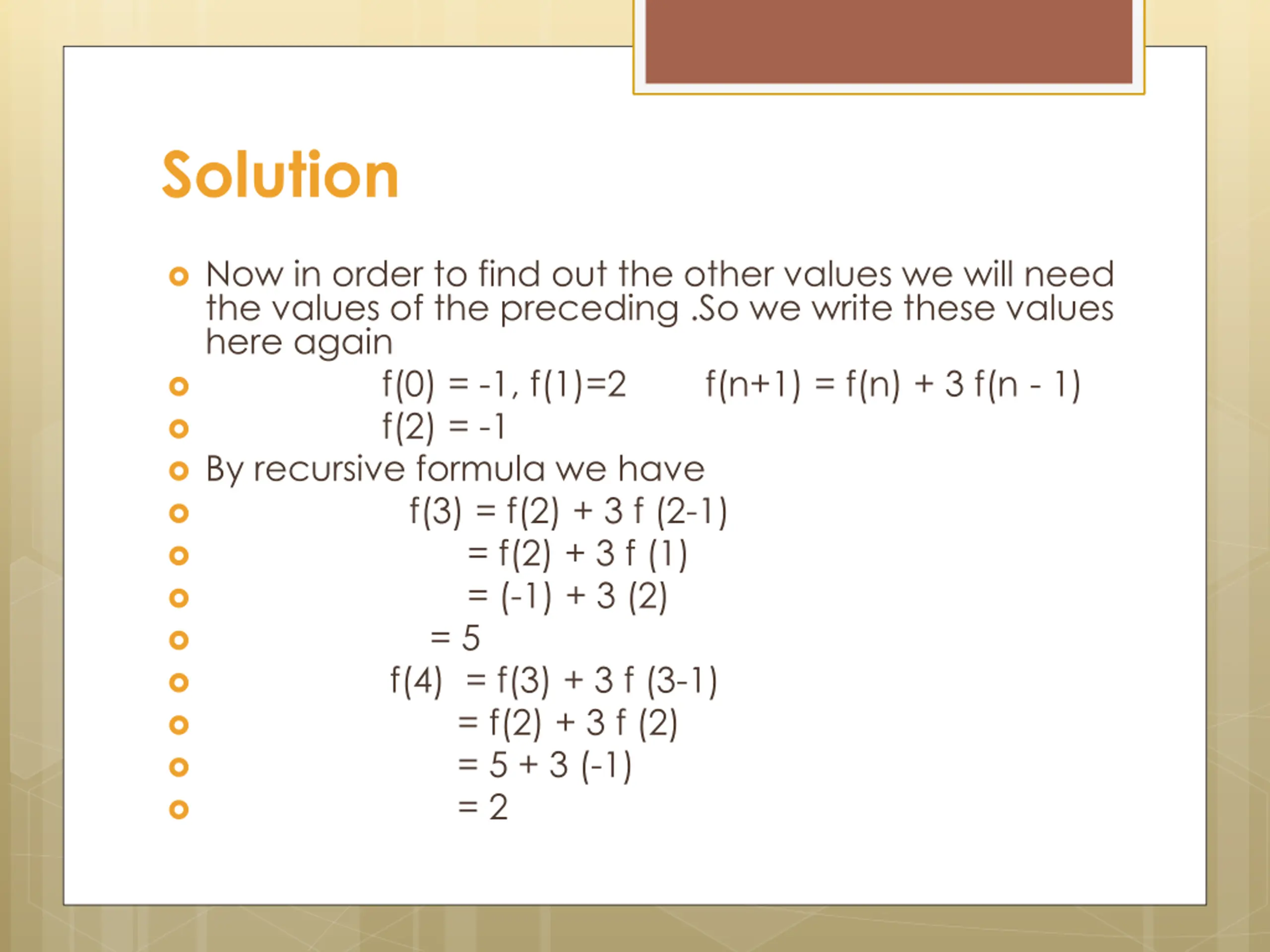 Solution Now in order to find out the other values we will need the values of the preceding .So we write these values here again f(0) = -1, f(1)=2 f(n+1) = f(n) + 3 f(n - 1) f(2) = -1 By recursive formula we have f(3) = f(2) + 3 f (2-1) = f(2) + 3 f (1) = (-1) + 3 (2) = 5 f(4) = f(3) + 3 f (3-1) = f(2) + 3 f (2) = 5 + 3 (-1) = 2