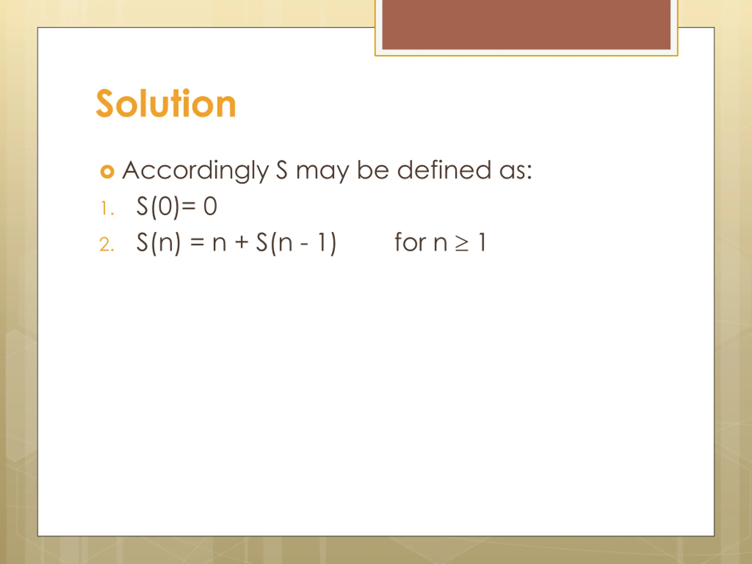 Solution Accordingly S may be defined as: 1. S(0)= 0 2. S(n) = n + S(n - 1) for n 1