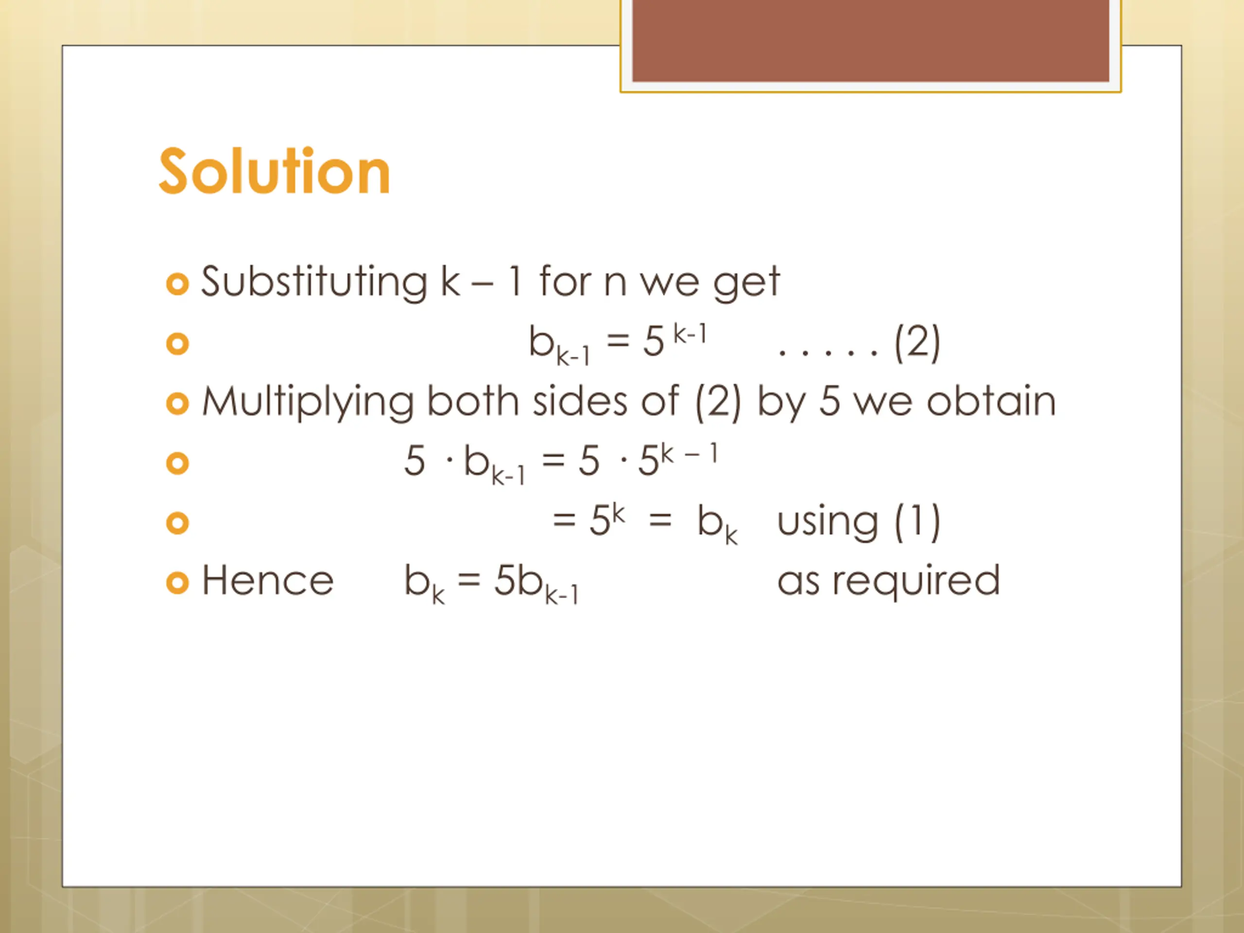 Solution Substituting k 1 for n we get bk-1= 5k-1 . . . . . (2) Multiplying both sides of (2) by 5 we obtain 5 bk-1= 5 5k 1 = 5k= bk Hence bk= 5bk-1 using (1) as required