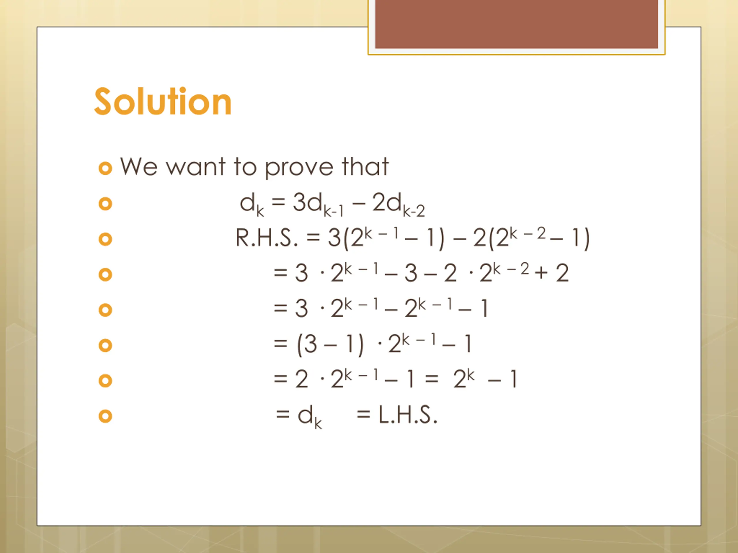 Solution We want to prove that dk= 3dk-1 2dk-2 R.H.S. = 3(2k 1 1) 2(2k 2 1) = 3 2k 1 3 2 2k 2 + 2 = 3 2k 1 2k 1 1 = (3 1) 2k 1 1 = 2 2k 1 1 = 2k 1 = dk = L.H.S.