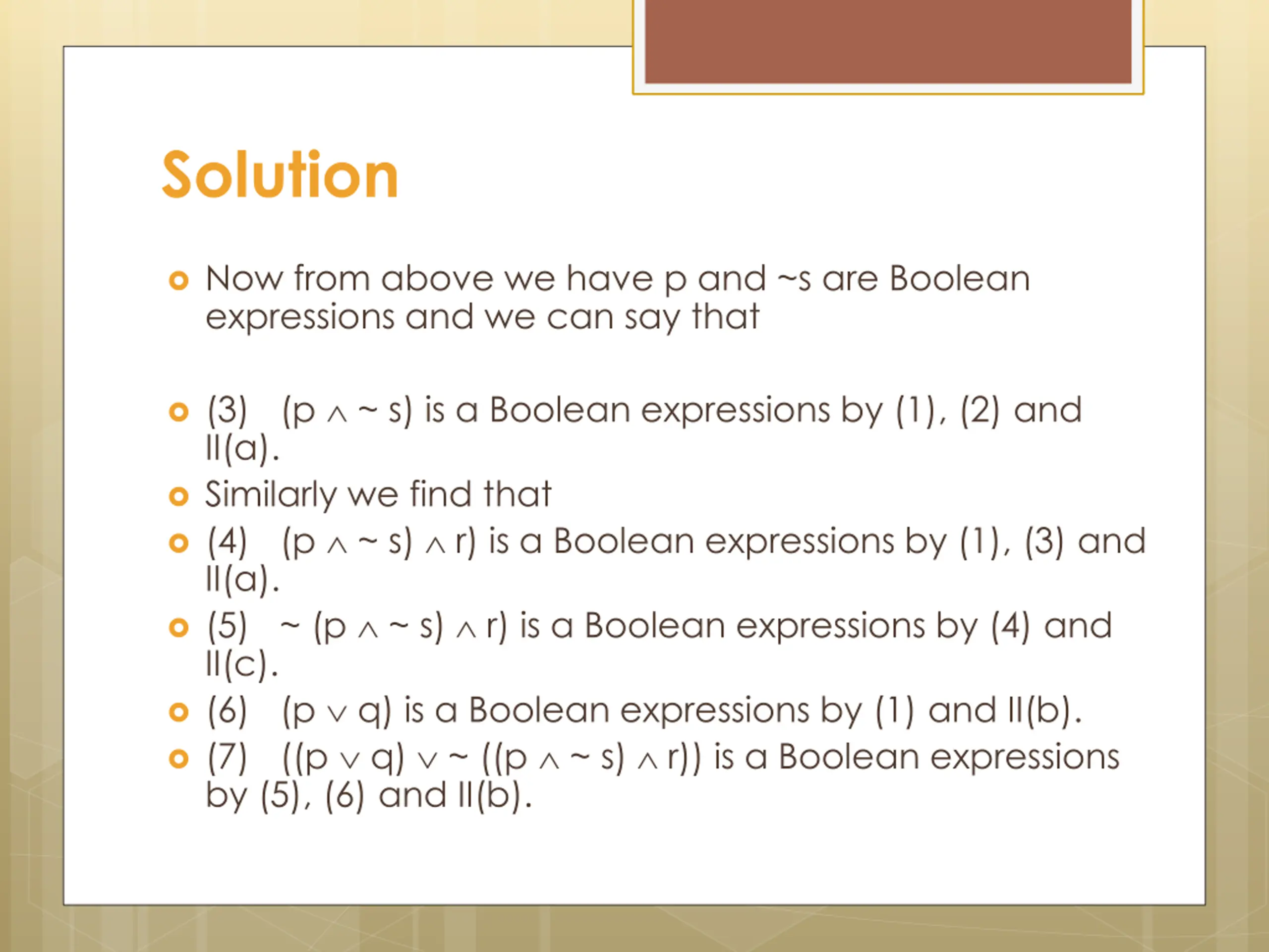 Solution Now from above we have p and ~s are Boolean expressions and we can say that (3) (p ~ s) is a Boolean expressions by (1), (2) and II(a). Similarly we find that (4) (p ~ s) r) is a Boolean expressions by (1), (3) and II(a). (5) ~ (p ~ s) r) is a Boolean expressions by (4) and II(c). (6) (p q) is a Boolean expressions by (1) and II(b). (7) ((p q) ~ ((p ~ s) r)) is a Boolean expressions by (5), (6) and II(b).