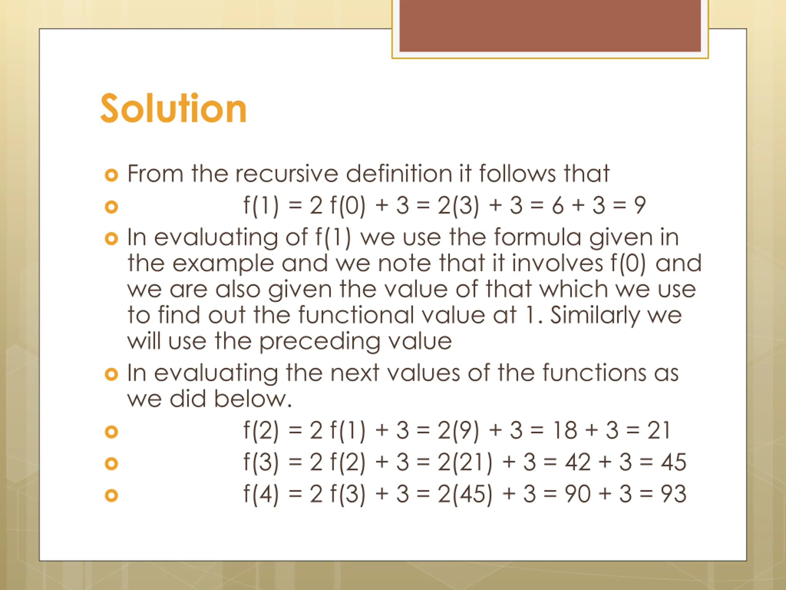 Solution From the recursive definition it follows that f(1) = 2 f(0) + 3 = 2(3) + 3 = 6 + 3 = 9 In evaluating of f(1) we use the formula given in the example and we note that it involves f(0) and we are also given the value of that which we use to find out the functional value at 1. Similarly we will use the preceding value In evaluating the next values of the functions as we did below. f(2) = 2 f(1) + 3 = 2(9) + 3 = 18 + 3 = 21 f(3) = 2 f(2) + 3 = 2(21) + 3 = 42 + 3 = 45 f(4) = 2 f(3) + 3 = 2(45) + 3 = 90 + 3 = 93
