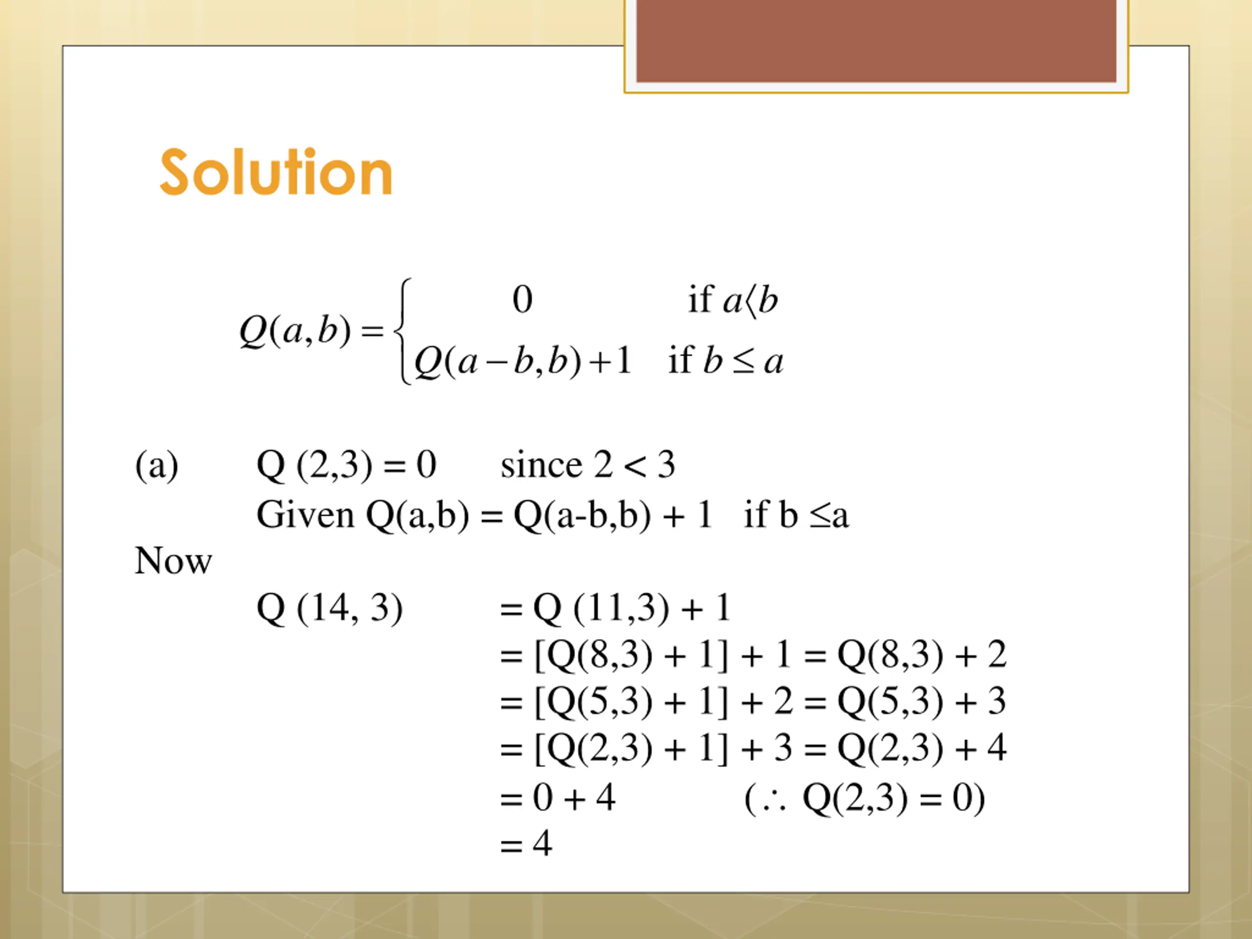 Solution SOLUTION: (a) Q (2,3) = 0 Given Q(a,b) = Q(a-b,b) + 1 if b a Now Q (14, 3) a b 0 if b = ( , ) Q a b Q a b b , ) 1 if + ( a since 2 < 3 = Q (11,3) + 1 = [Q(8,3) + 1] + 1 = Q(8,3) + 2 = [Q(5,3) + 1] + 2 = Q(5,3) + 3 = [Q(2,3) + 1] + 3 = Q(2,3) + 4 = 0 + 4 ( Q(2,3) = 0) = 4