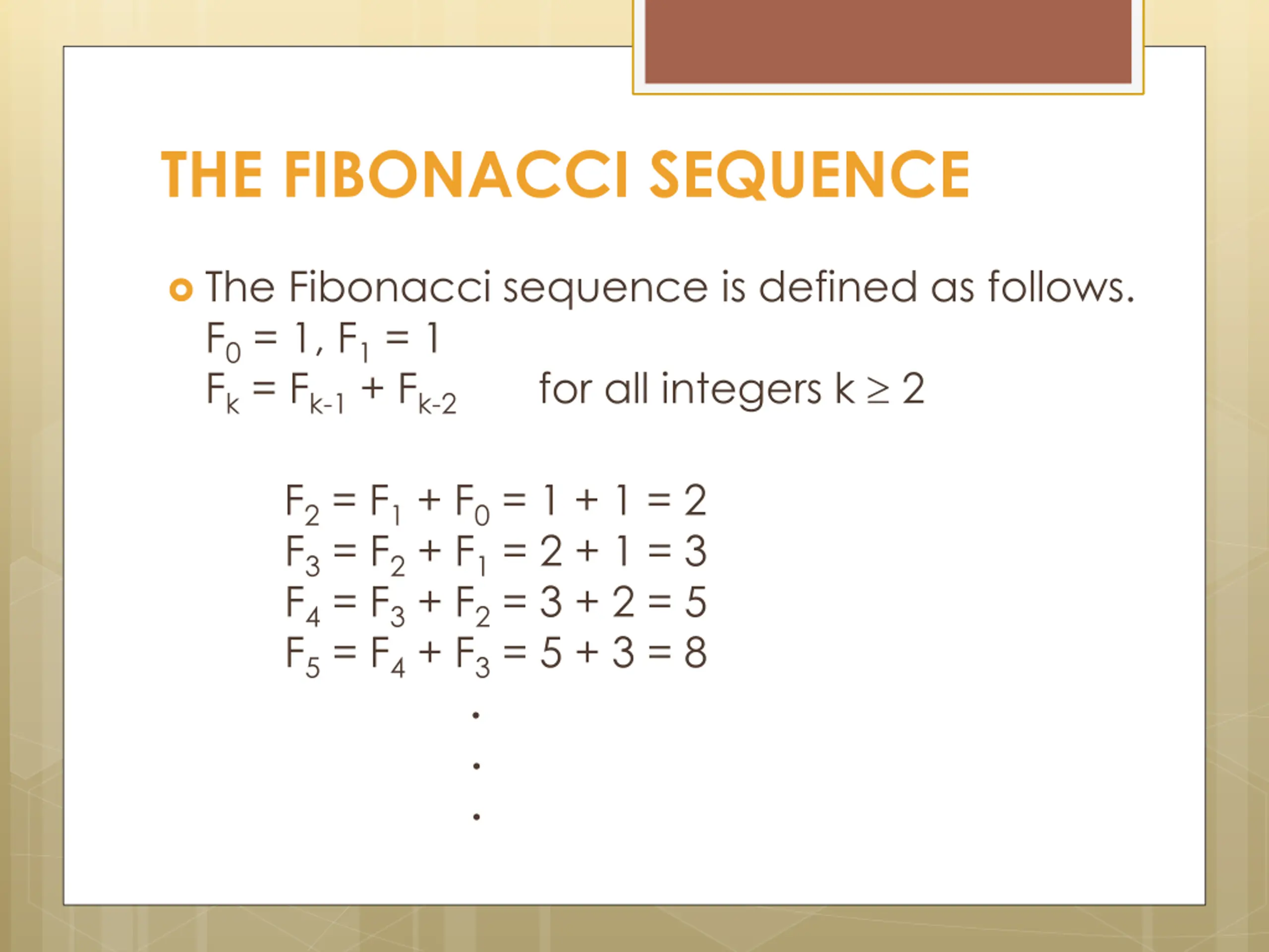 THE FIBONACCI SEQUENCE The Fibonacci sequence is defined as follows. F0= 1, F1= 1 Fk= Fk-1+ Fk-2 for all integers k 2 F2= F1+ F0= 1 + 1 = 2 F3= F2+ F1= 2 + 1 = 3 F4= F3+ F2= 3 + 2 = 5 F5= F4+ F3= 5 + 3 = 8 . . .