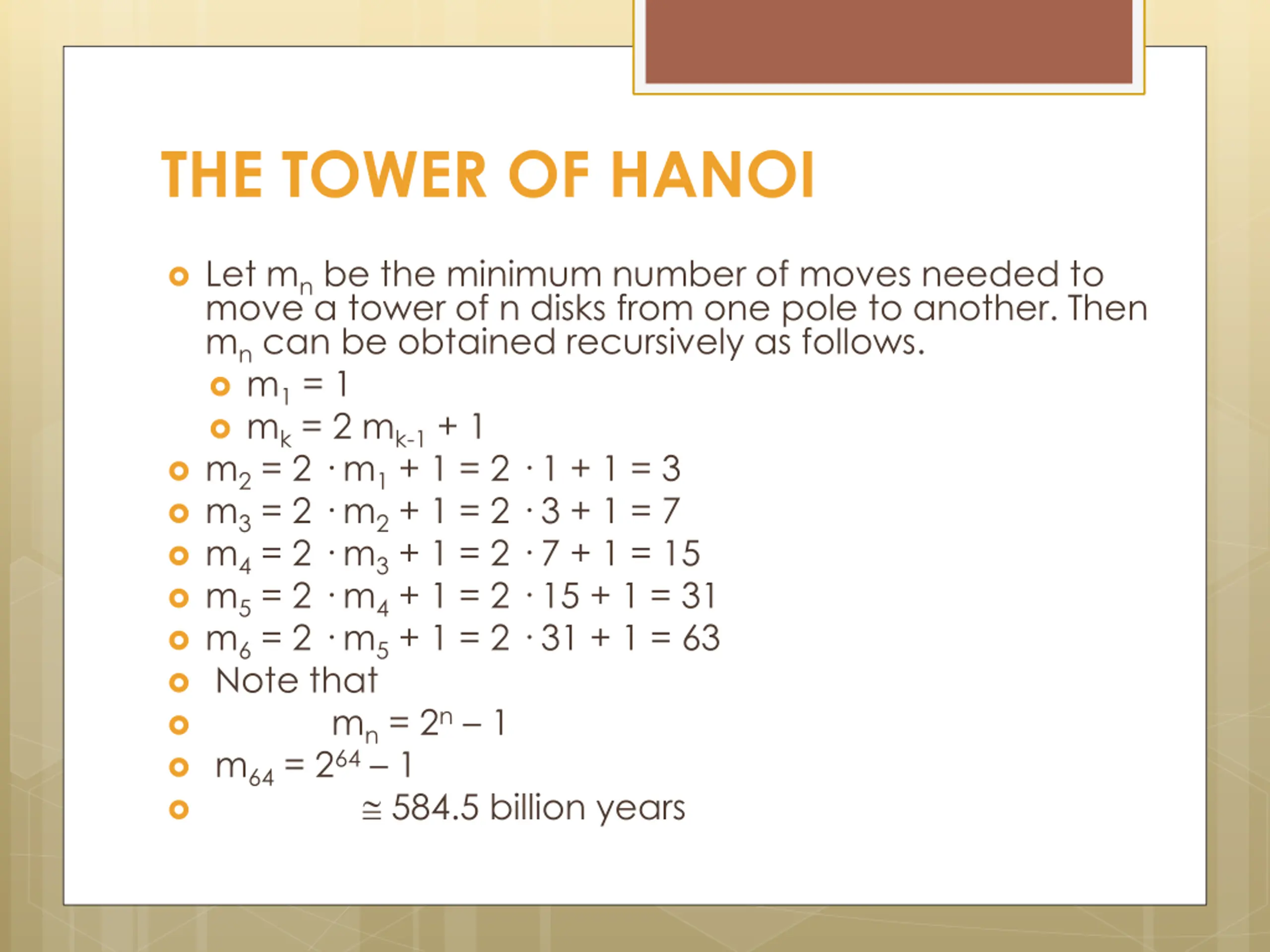 THE TOWER OF HANOI Let mnbe the minimum number of moves needed to move a tower of n disks from one pole to another. Then mncan be obtained recursively as follows. m1= 1 mk= 2 mk-1+ 1 m2= 2 m1+ 1 = 2 1 + 1 = 3 m3= 2 m2+ 1 = 2 3 + 1 = 7 m4= 2 m3+ 1 = 2 7 + 1 = 15 m5= 2 m4+ 1 = 2 15 + 1 = 31 m6= 2 m5+ 1 = 2 31 + 1 = 63 Note that mn= 2n 1 m64= 264 1 584.5 billion years