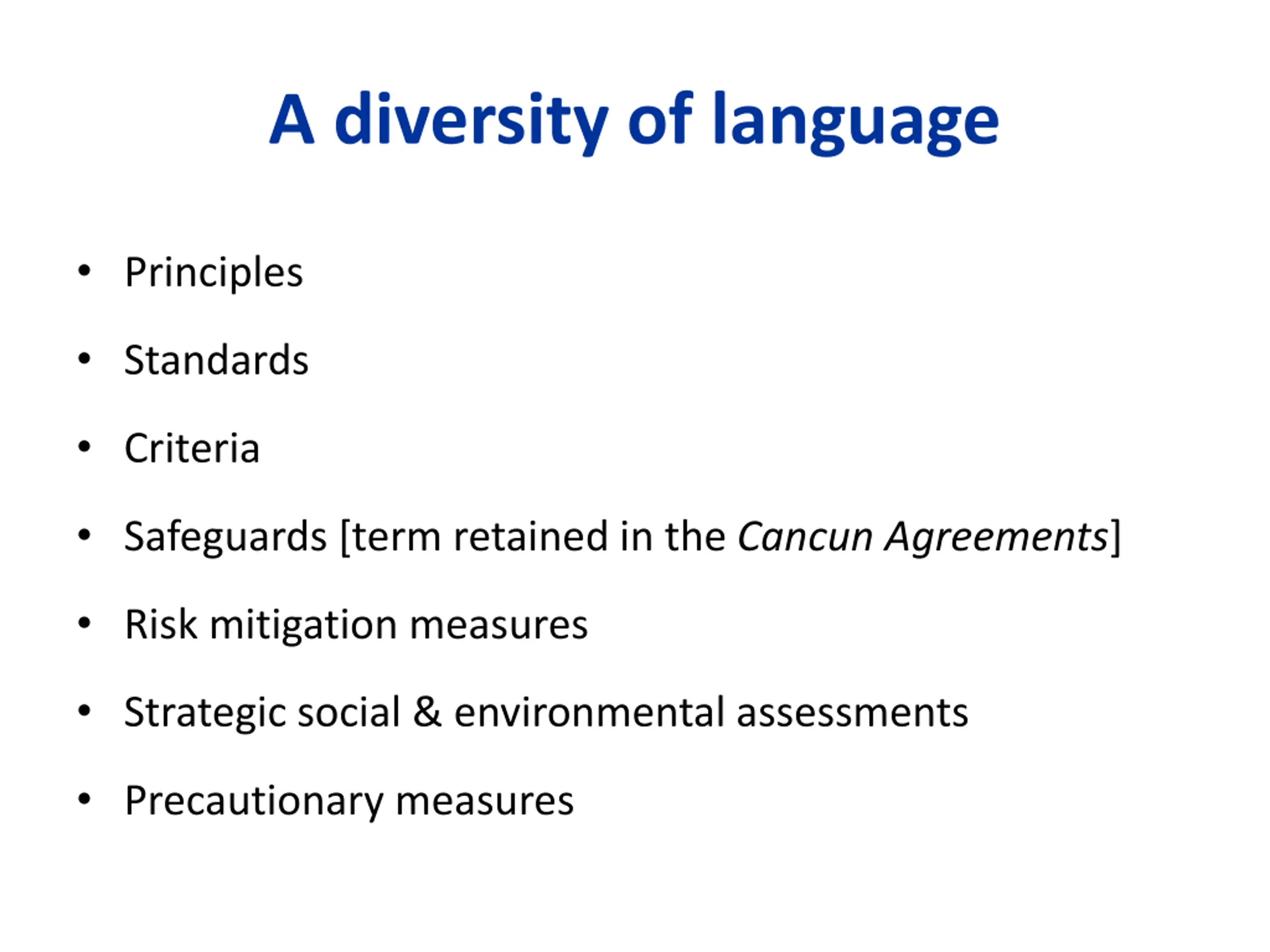 A diversity of language Principles Standards Criteria Safeguards [term retained in the Cancun Agreements] Risk mitigation measures Strategic social & environmental assessments Precautionary measures