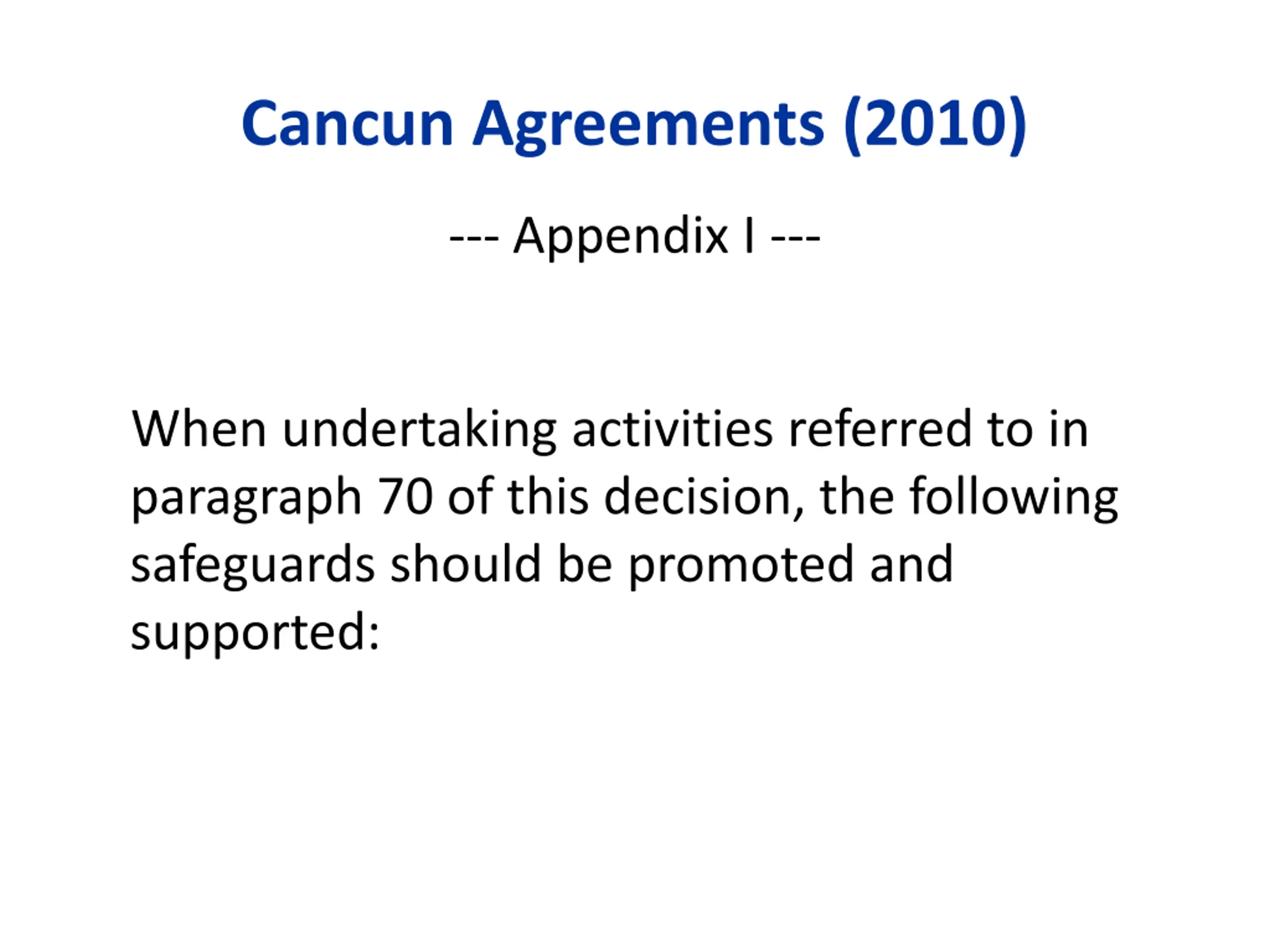 Cancun Agreements (2010) --- Appendix I --- When undertaking activities referred to in paragraph 70 of this decision, the following safeguards should be promoted and supported: