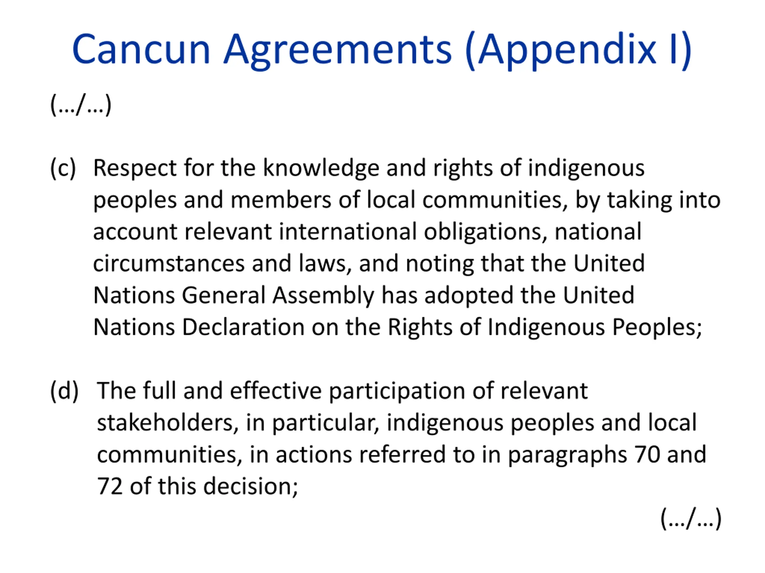 Cancun Agreements (Appendix I) ( / ) (c) Respect for the knowledge and rights of indigenous peoples and members of local communities, by taking into account relevant international obligations, national circumstances and laws, and noting that the United Nations General Assembly has adopted the United Nations Declaration on the Rights of Indigenous Peoples; (d) The full and effective participation of relevant stakeholders, in particular, indigenous peoples and local communities, in actions referred to in paragraphs 70 and 72 of this decision; ( / )