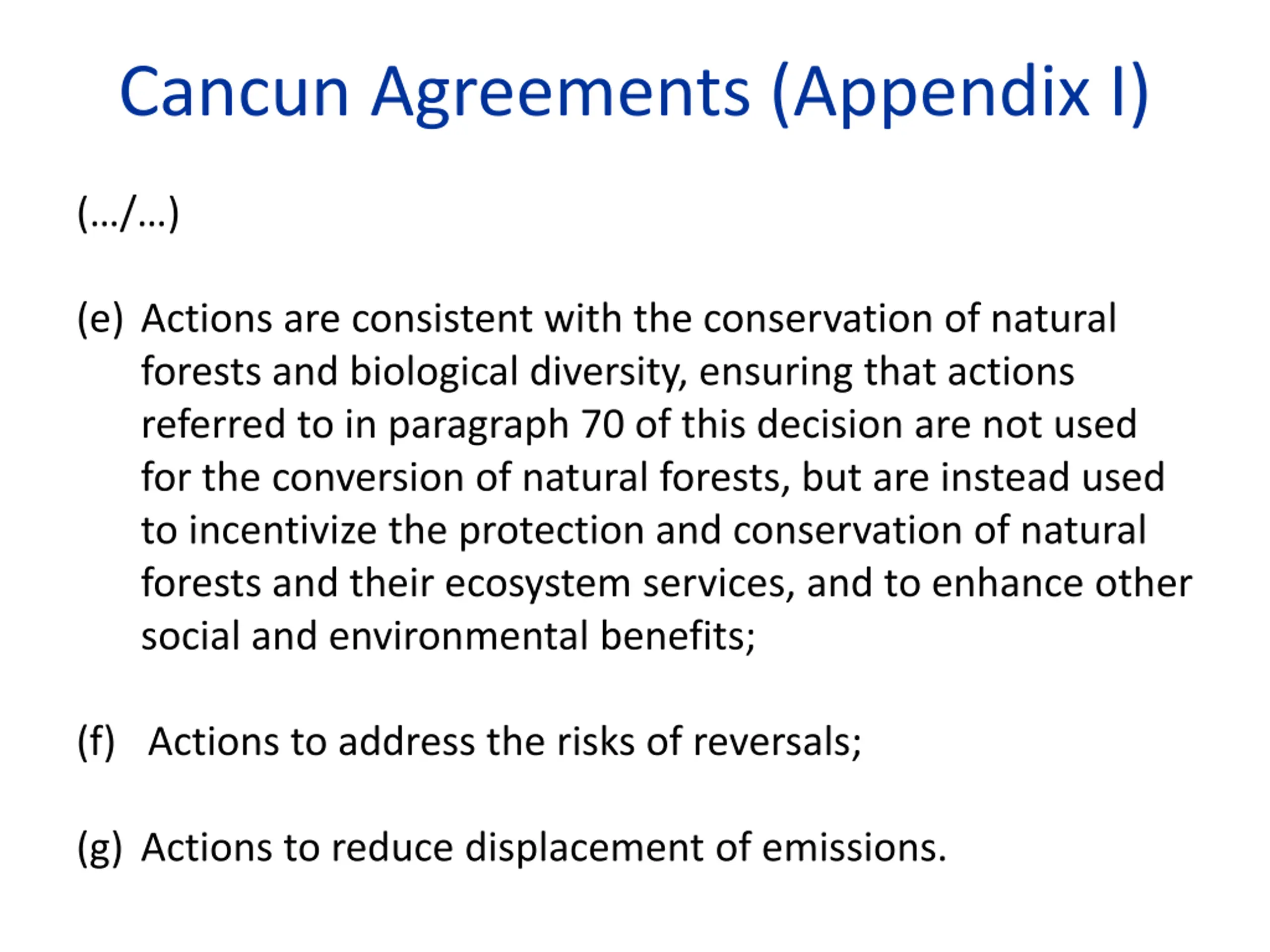 Cancun Agreements (Appendix I) ( / ) (e) Actions are consistent with the conservation of natural forests and biological diversity, ensuring that actions referred to in paragraph 70 of this decision are not used for the conversion of natural forests, but are instead used to incentivize the protection and conservation of natural forests and their ecosystem services, and to enhance other social and environmental benefits; (f) Actions to address the risks of reversals; (g) Actions to reduce displacement of emissions.