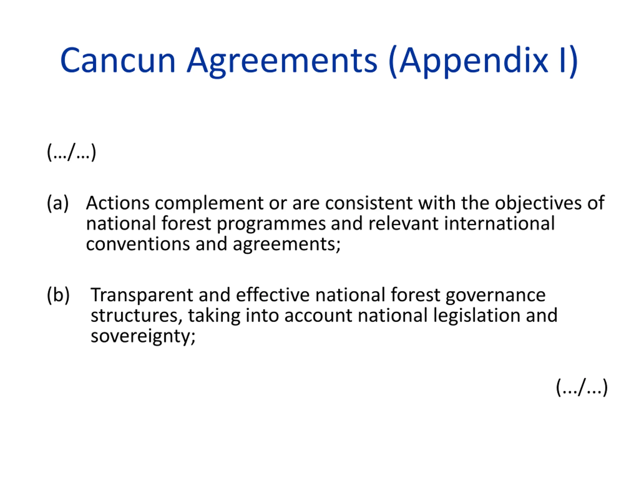 Cancun Agreements (Appendix I) ( / ) (a) Actions complement or are consistent with the objectives of national forest programmes and relevant international conventions and agreements; (b) Transparent and effective national forest governance structures, taking into account national legislation and sovereignty; (.../...)