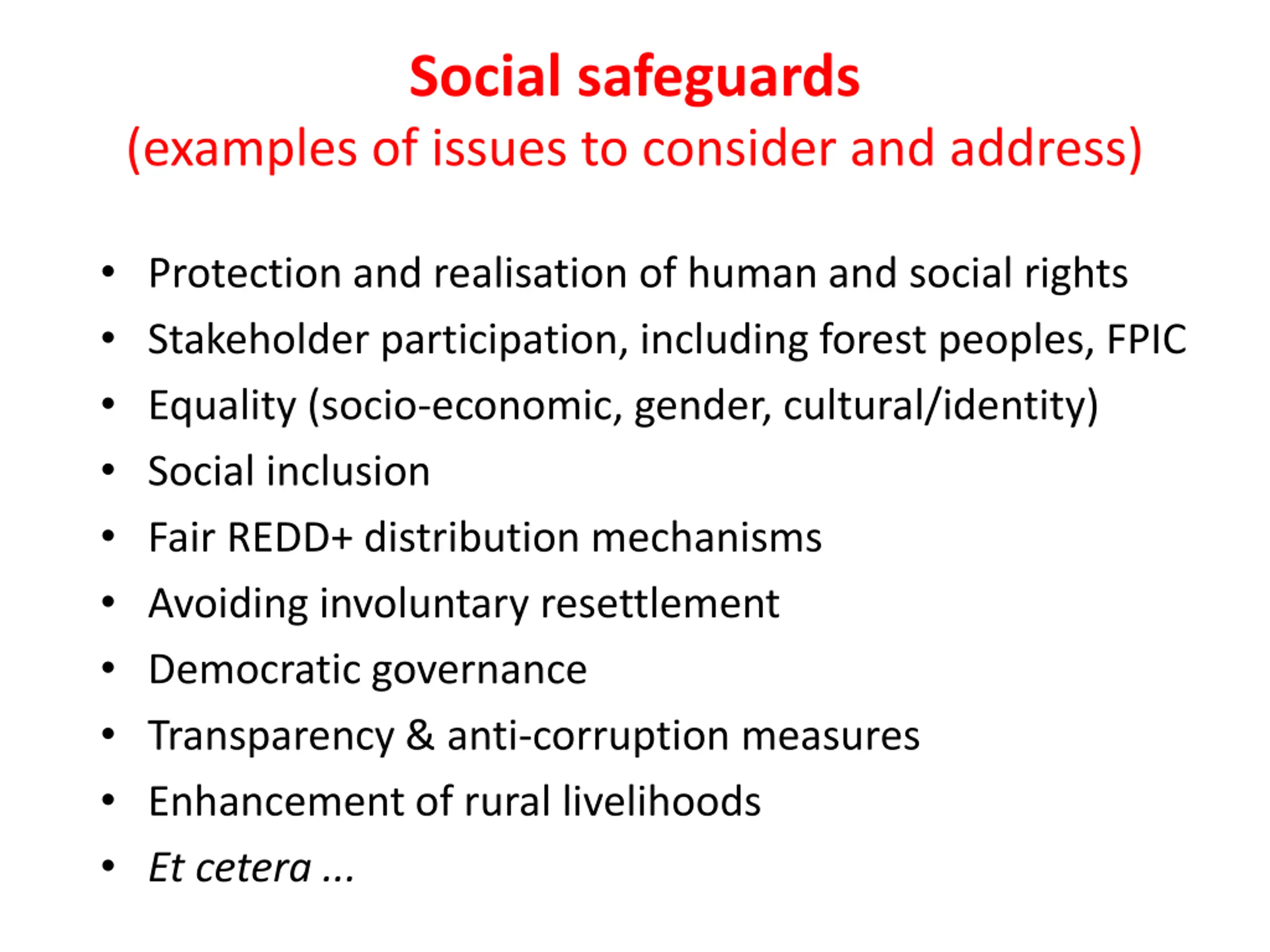 Social safeguards (examples of issues to consider and address) Protection and realisation of human and social rights Stakeholder participation, including forest peoples, FPIC Equality (socio-economic, gender, cultural/identity) Social inclusion Fair REDD+ distribution mechanisms Avoiding involuntary resettlement Democratic governance Transparency & anti-corruption measures Enhancement of rural livelihoods Et cetera ...