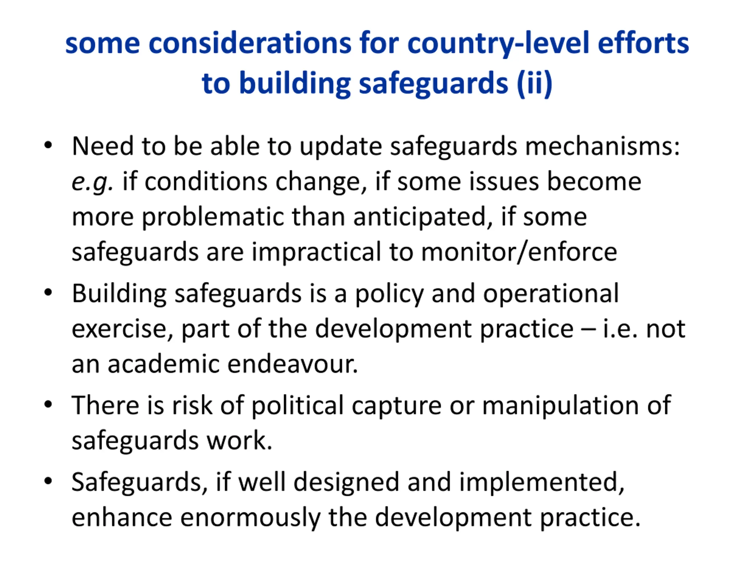 some considerations for country-level efforts to building safeguards (ii) Need to be able to update safeguards mechanisms: e.g. if conditions change, if some issues become more problematic than anticipated, if some safeguards are impractical to monitor/enforce Building safeguards is a policy and operational exercise, part of the development practice i.e. not an academic endeavour. There is risk of political capture or manipulation of safeguards work. Safeguards, if well designed and implemented, enhance enormously the development practice.