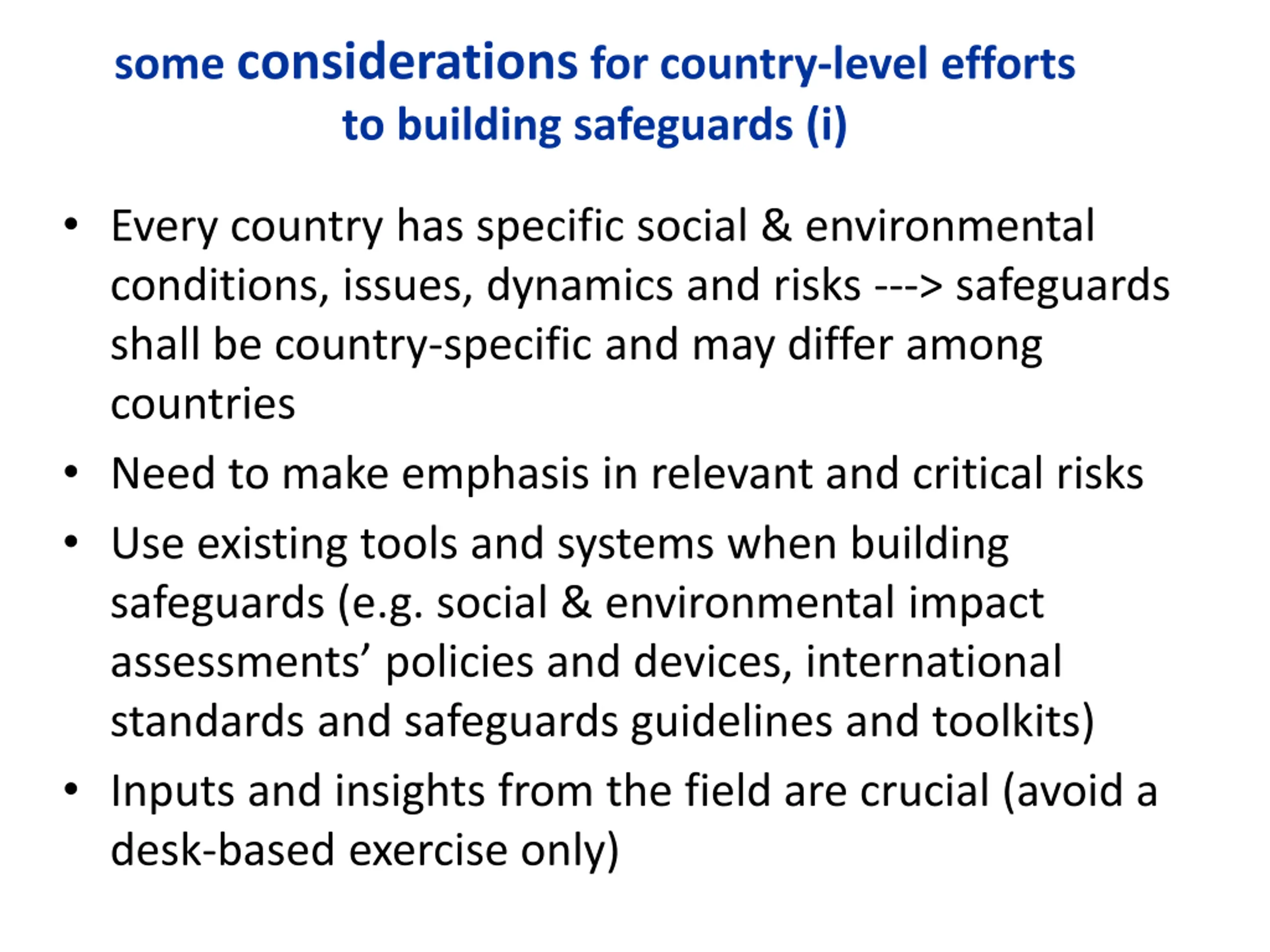 some considerations for country-level efforts to building safeguards (i) Every country has specific social & environmental conditions, issues, dynamics and risks ---> safeguards shall be country-specific and may differ among countries Need to make emphasis in relevant and critical risks Use existing tools and systems when building safeguards (e.g. social & environmental impact assessments policies and devices, international standards and safeguards guidelines and toolkits) Inputs and insights from the field are crucial (avoid a desk-based exercise only)