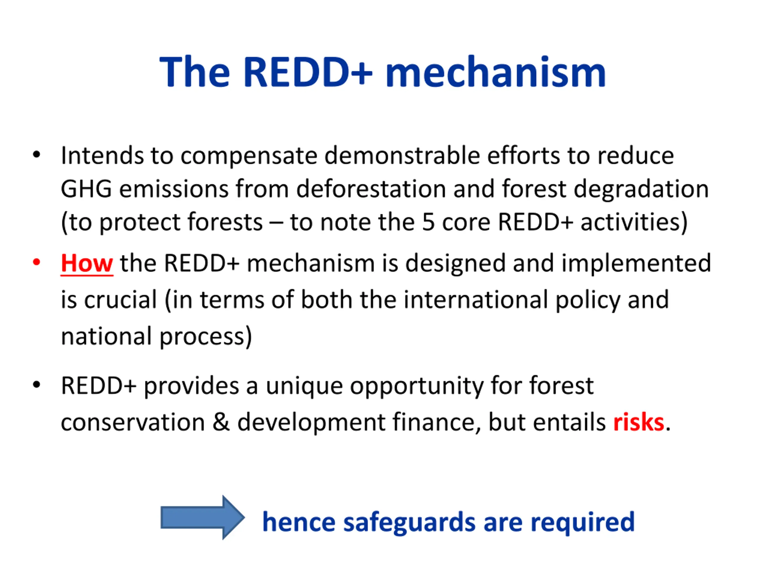 The REDD+ mechanism Intends to compensate demonstrable efforts to reduce GHG emissions from deforestation and forest degradation (to protect forests to note the 5 core REDD+ activities) How the REDD+ mechanism is designed and implemented is crucial (in terms of both the international policy and national process) REDD+ provides a unique opportunity for forest conservation & development finance, but entails risks. hence safeguards are required