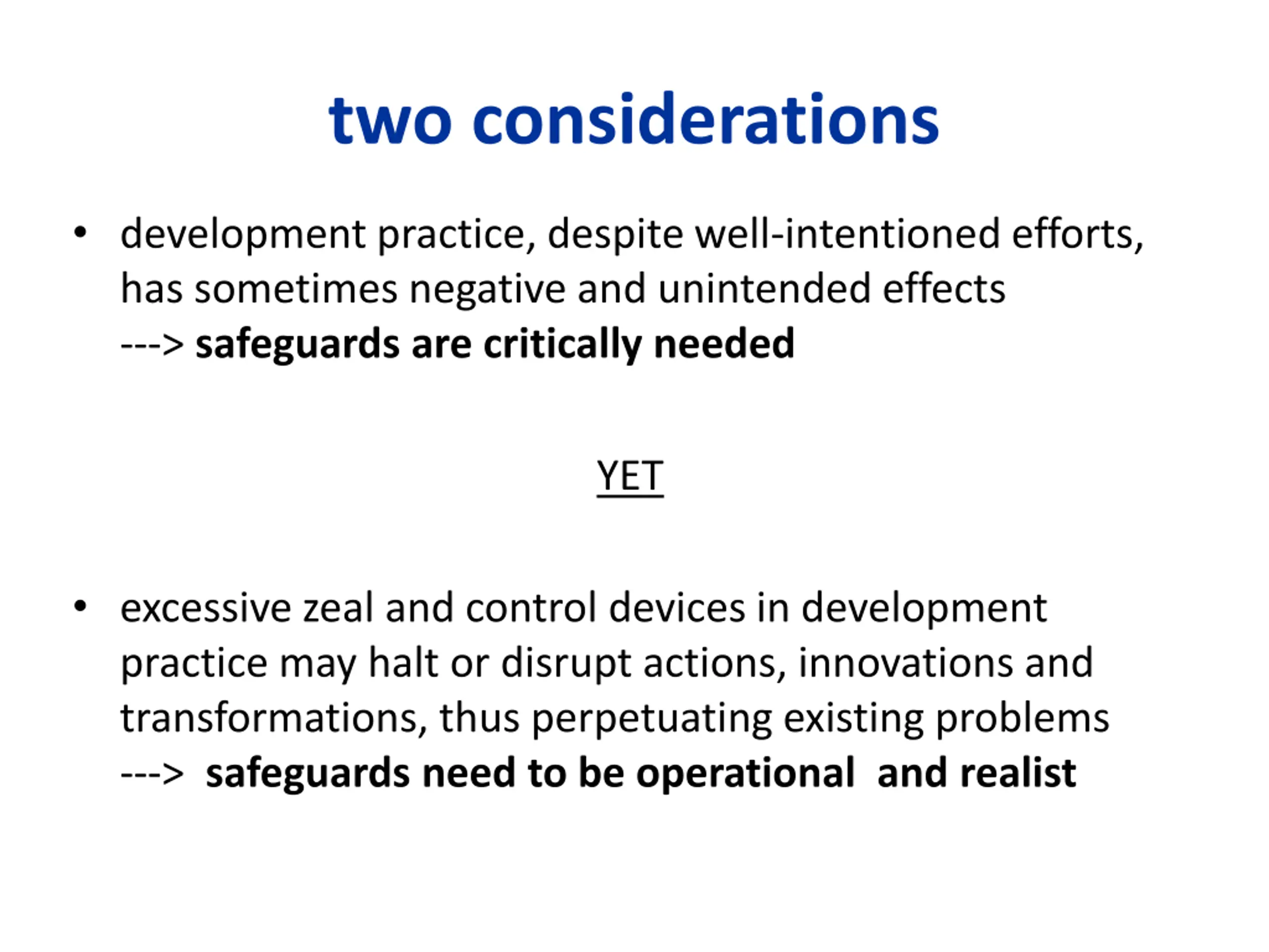 two considerations development practice, despite well-intentioned efforts, has sometimes negative and unintended effects ---> safeguards are critically needed YET excessive zeal and control devices in development practice may halt or disrupt actions, innovations and transformations, thus perpetuating existing problems ---> safeguards need to be operational and realist