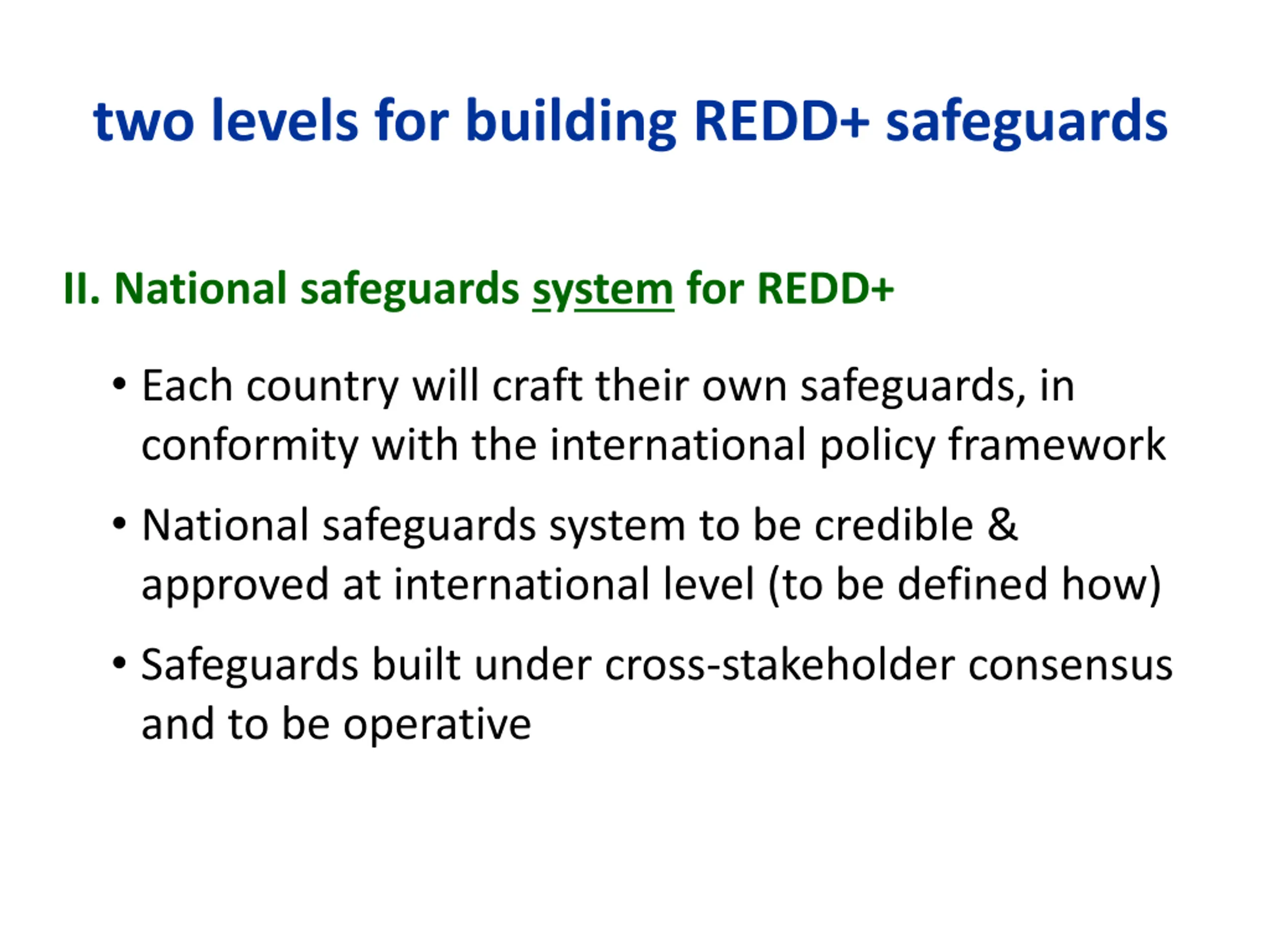two levels for building REDD+ safeguards II. National safeguards system for REDD+ Each country will craft their own safeguards, in conformity with the international policy framework National safeguards system to be credible & approved at international level (to be defined how) Safeguards built under cross-stakeholder consensus and to be operative