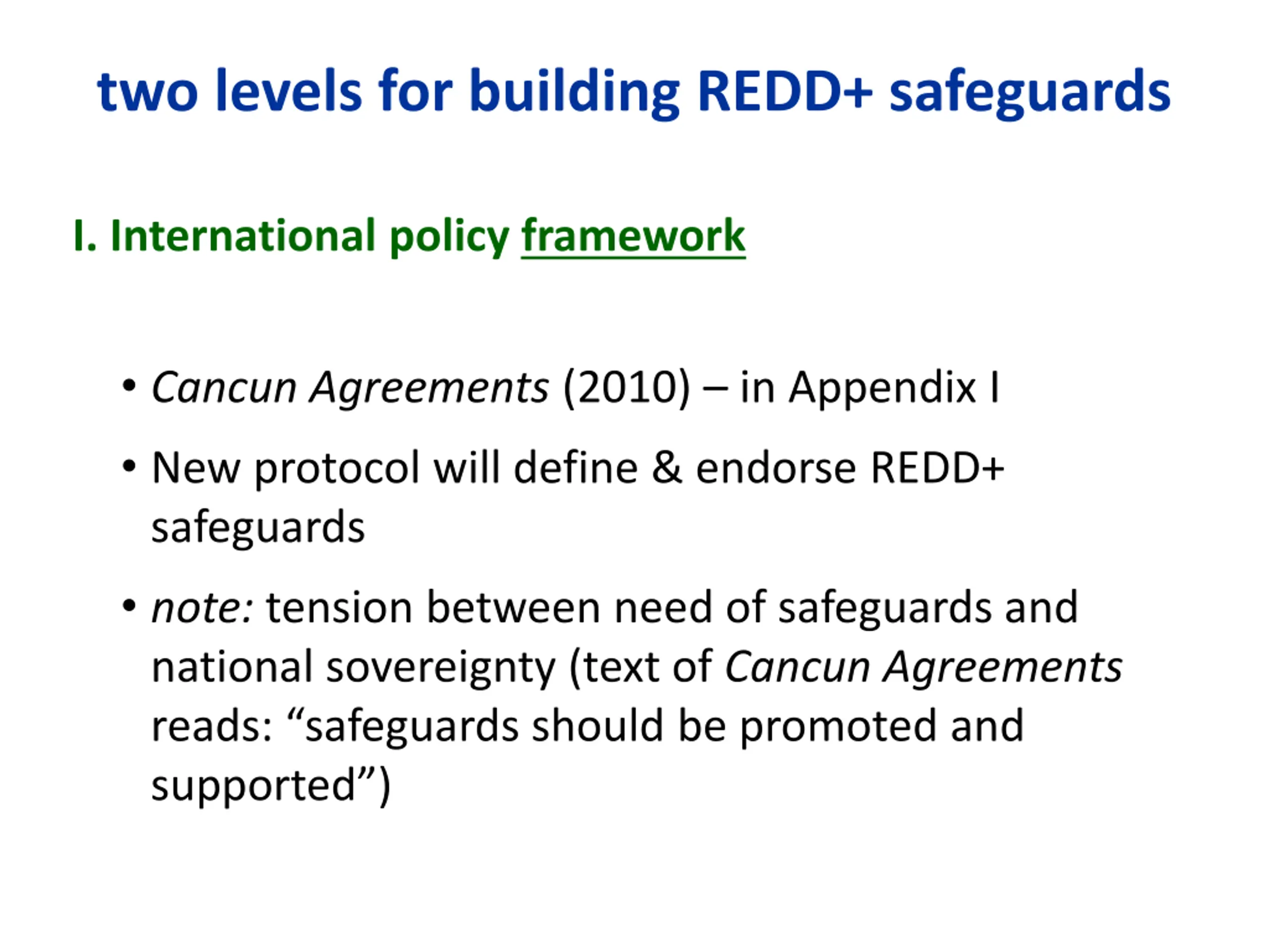 two levels for building REDD+ safeguards I. International policy framework Cancun Agreements (2010) in Appendix I New protocol will define & endorse REDD+ safeguards note: tension between need of safeguards and national sovereignty (text of Cancun Agreements reads: safeguards should be promoted and supported )