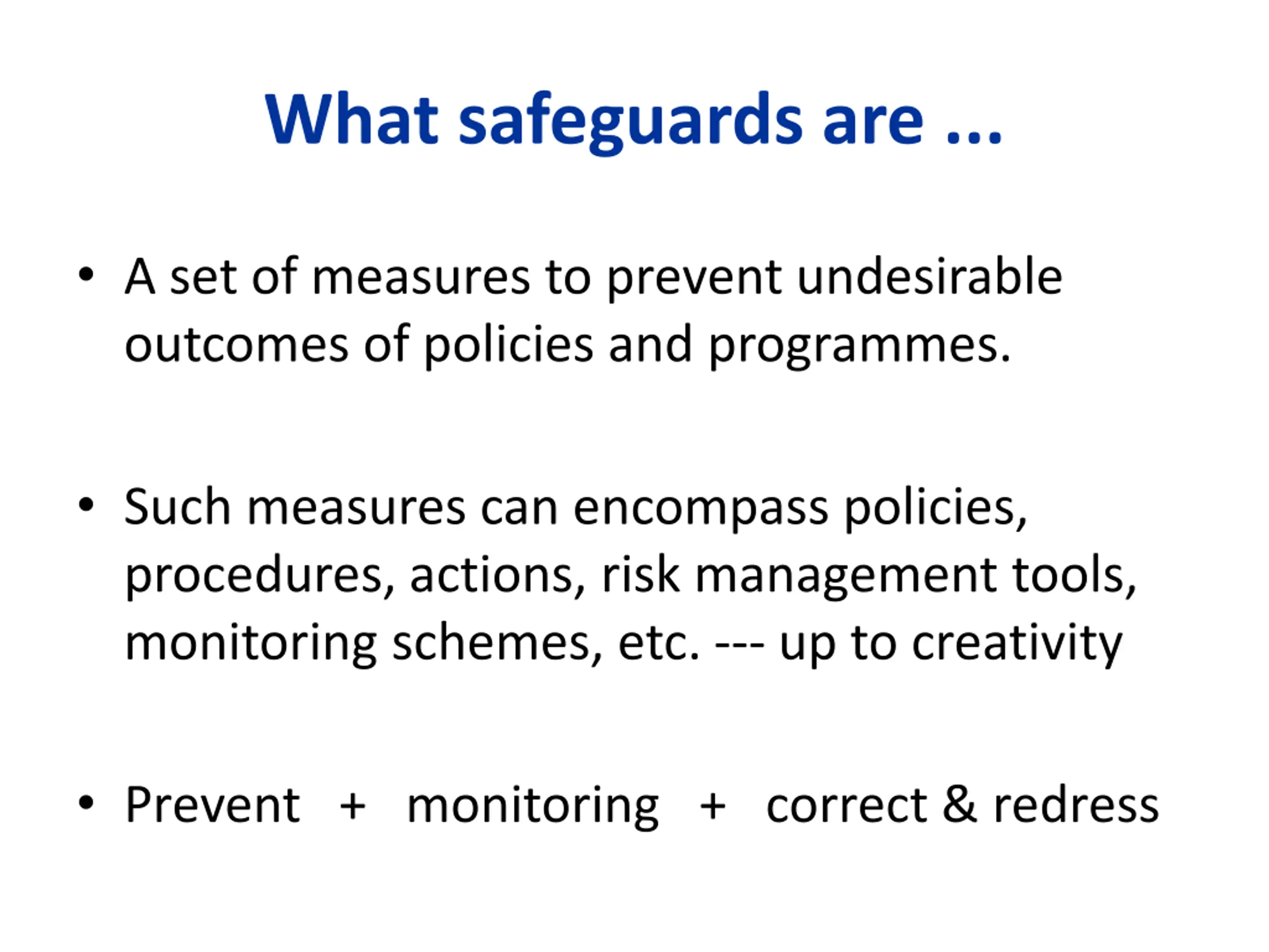 What safeguards are ... A set of measures to prevent undesirable outcomes of policies and programmes. Such measures can encompass policies, procedures, actions, risk management tools, monitoring schemes, etc. --- up to creativity Prevent + monitoring + correct & redress