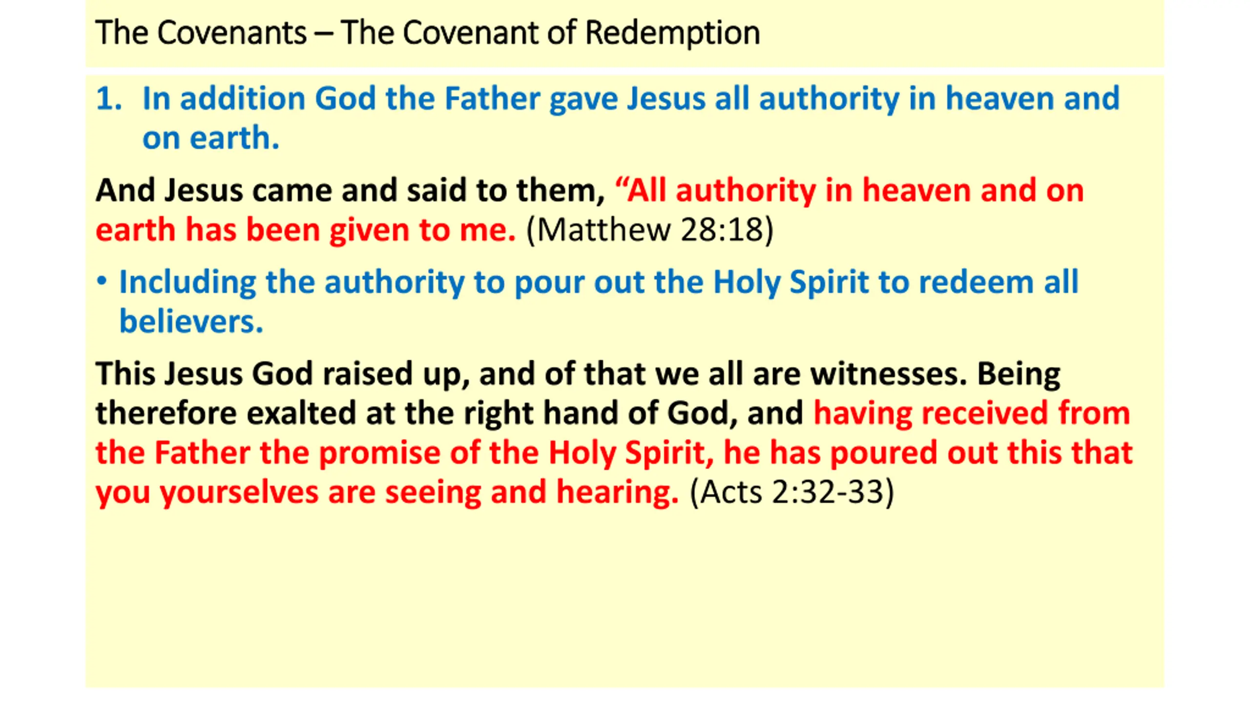 The Covenants The Covenants The Covenant of Redemption The Covenant of Redemption 1. In addition God the Father gave Jesus all authority in heaven and on earth. And Jesus came and said to them, All authority in heaven and on earth has been given to me. (Matthew 28:18) Including the authority to pour out the Holy Spirit to redeem all believers. This Jesus God raised up, and of that we all are witnesses. Being therefore exalted at the right hand of God, and having received from the Father the promise of the Holy Spirit, he has poured out this that you yourselves are seeing and hearing. (Acts 2:32-33)