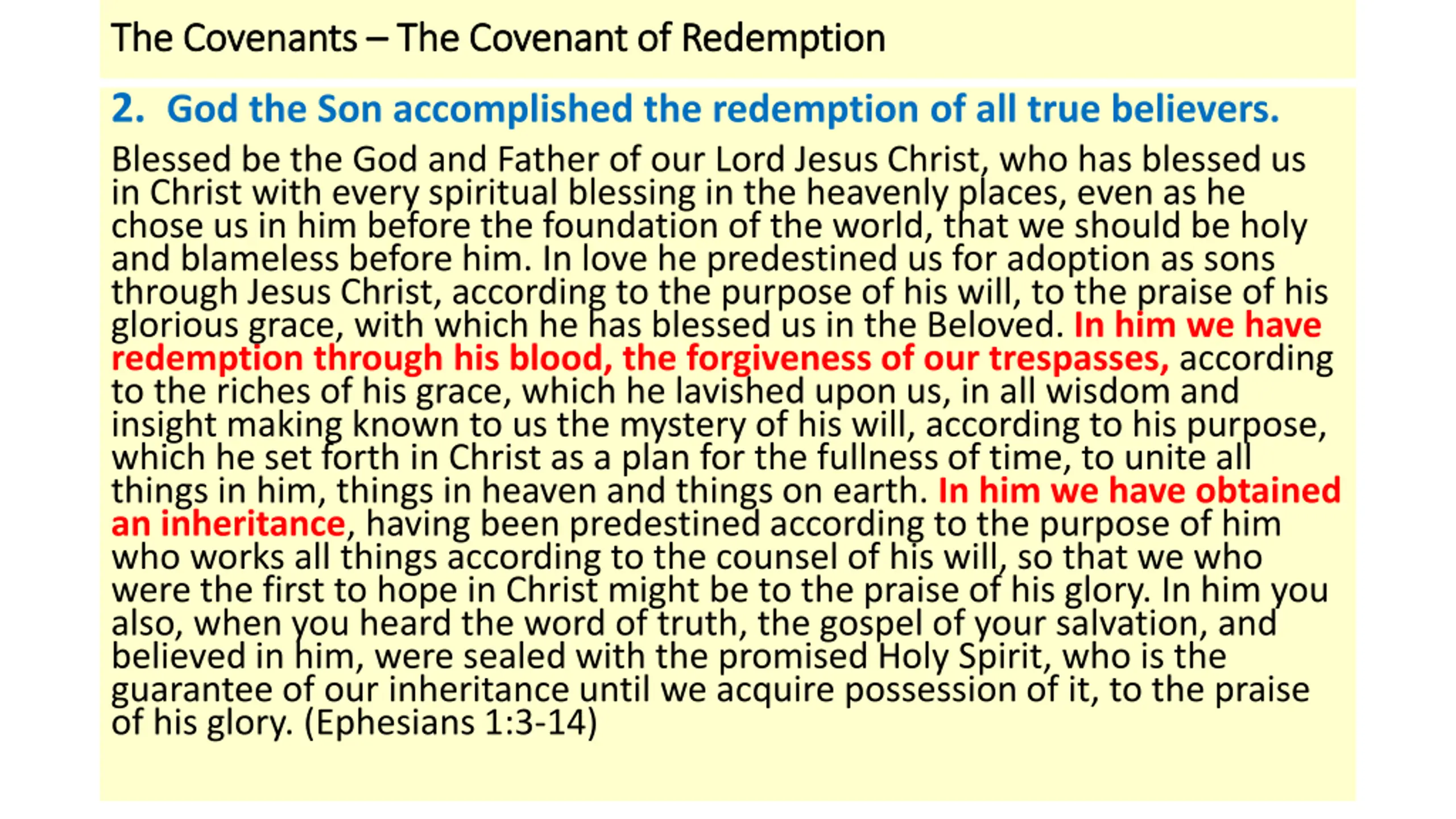 The Covenants The Covenants The Covenant of Redemption The Covenant of Redemption 2. God the Son accomplished the redemption of all true believers. Blessed be the God and Father of our Lord Jesus Christ, who has blessed us in Christ with every spiritual blessing in the heavenly places, even as he chose us in him before the foundation of the world, that we should be holy and blameless before him. In love he predestined us for adoption as sons through Jesus Christ, according to the purpose of his will, to the praise of his glorious grace, with which he has blessed us in the Beloved. In him we have redemption through his blood, the forgiveness of our trespasses, according to the riches of his grace, which he lavished upon us, in all wisdom and insight making known to us the mystery of his will, according to his purpose, which he set forth in Christ as a plan for the fullness of time, to unite all things in him, things in heaven and things on earth. In him we have obtained an inheritance, having been predestined according to the purpose of him who works all things according to the counsel of his will, so that we who were the first to hope in Christ might be to the praise of his glory. In him you also, when you heard the word of truth, the gospel of your salvation, and believed in him, were sealed with the promised Holy Spirit, who is the guarantee of our inheritance until we acquire possession of it, to the praise of his glory. (Ephesians 1:3-14)