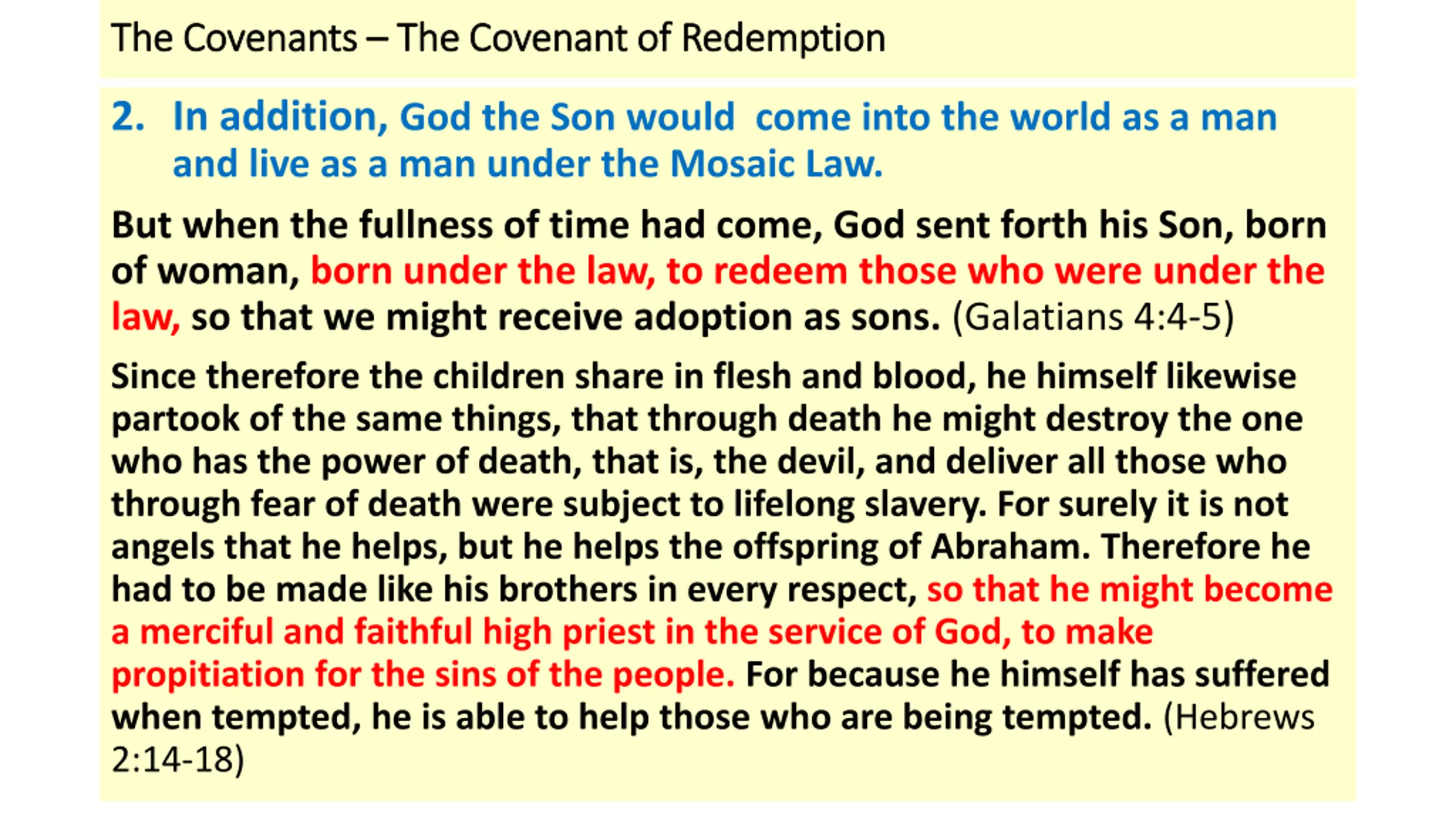 The Covenants The Covenants The Covenant of Redemption The Covenant of Redemption 2. In addition, God the Son would come into the world as a man and live as a man under the Mosaic Law. But when the fullness of time had come, God sent forth his Son, born of woman, born under the law, to redeem those who were under the law, so that we might receive adoption as sons. (Galatians 4:4-5) Since therefore the children share in flesh and blood, he himself likewise partook of the same things, that through death he might destroy the one who has the power of death, that is, the devil, and deliver all those who through fear of death were subject to lifelong slavery. For surely it is not angels that he helps, but he helps the offspring of Abraham. Therefore he had to be made like his brothers in every respect, so that he might become a merciful and faithful high priest in the service of God, to make propitiation for the sins of the people. For because he himself has suffered when tempted, he is able to help those who are being tempted. (Hebrews 2:14-18)