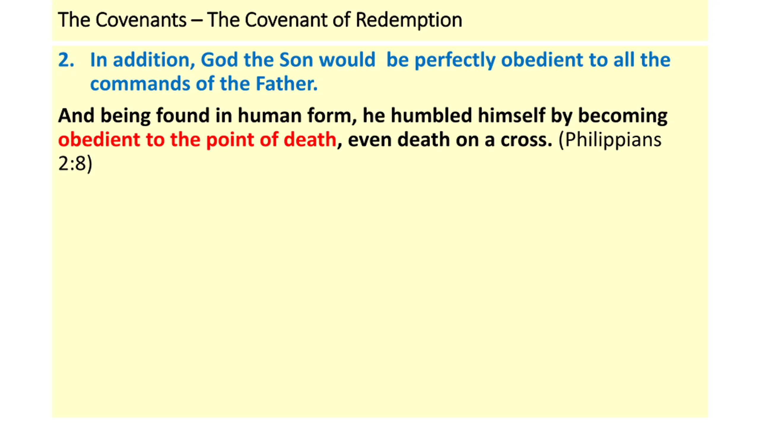 The Covenants The Covenants The Covenant of Redemption The Covenant of Redemption 2. In addition, God the Son would be perfectly obedient to all the commands of the Father. And being found in human form, he humbled himself by becoming obedient to the point of death, even death on a cross. (Philippians 2:8)