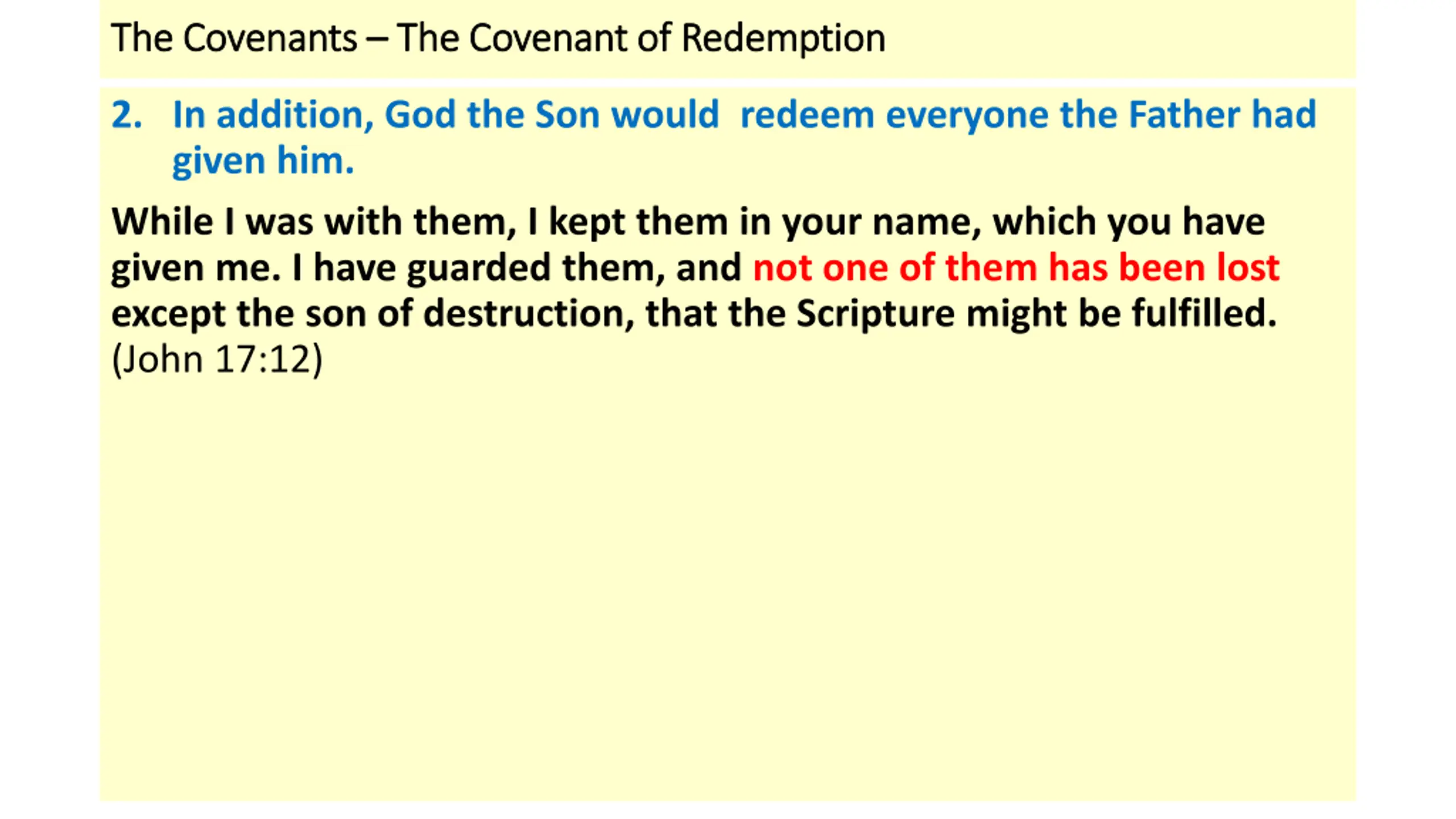 The Covenants The Covenants The Covenant of Redemption The Covenant of Redemption 2. In addition, God the Son would redeem everyone the Father had given him. While I was with them, I kept them in your name, which you have given me. I have guarded them, and not one of them has been lost except the son of destruction, that the Scripture might be fulfilled. (John 17:12)