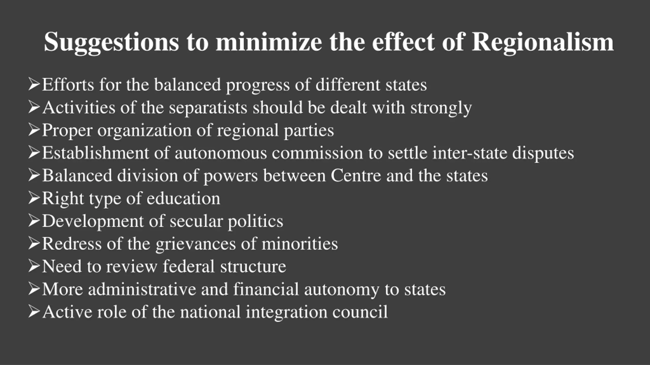 Suggestions to minimize the effect of Regionalism Efforts for the balanced progress of different states Activities of the separatists should be dealt with strongly Proper organization of regional parties Establishment of autonomous commission to settle inter-state disputes Balanced division of powers between Centre and the states Right type of education Development of secular politics Redress of the grievances of minorities Need to review federal structure More administrative and financial autonomy to states Active role of the national integration council