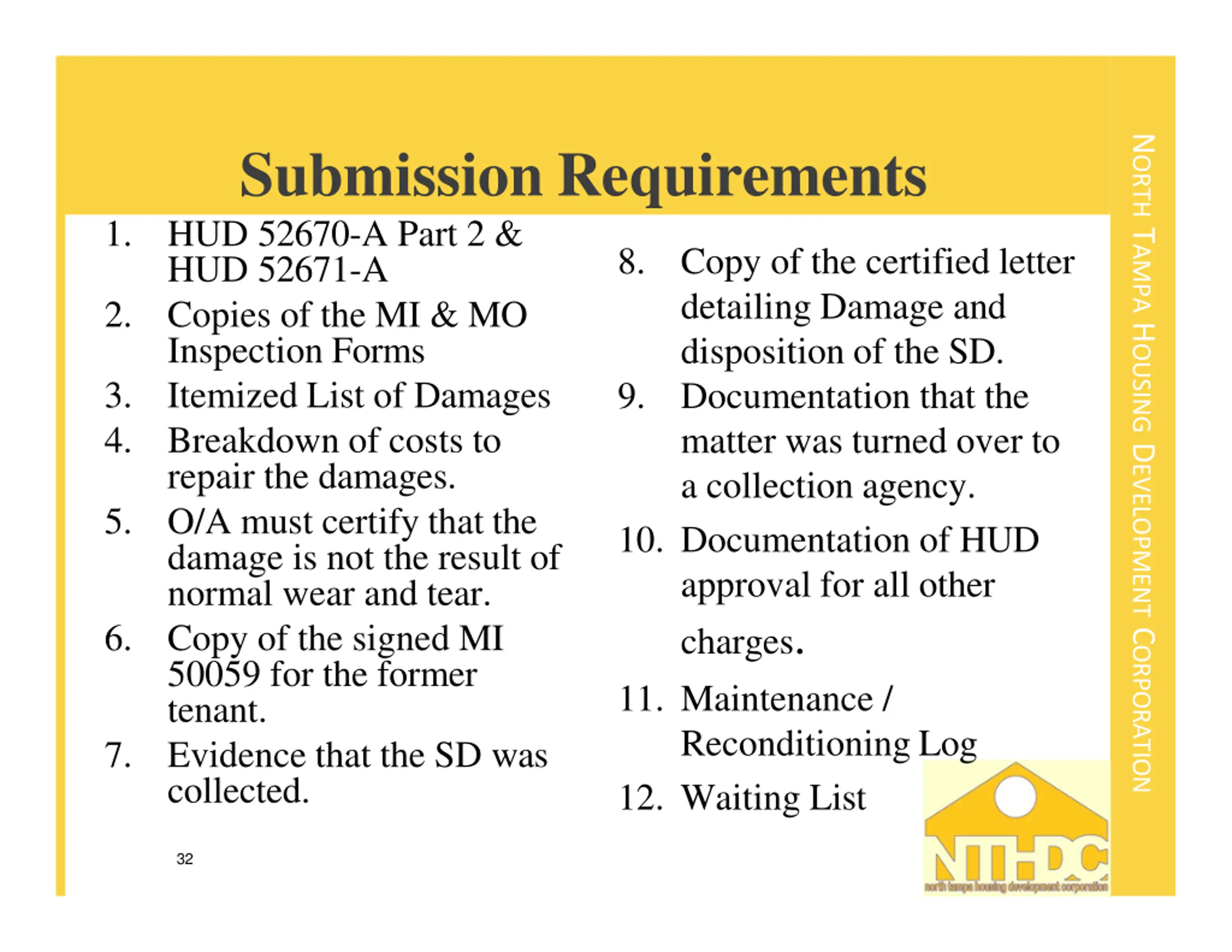 NORTH TAMPA HOUSING DEVELOPMENT CORPORATION Submission Requirements HUD 52670-A Part 2 & HUD 52671-A Copies of the MI & MO Inspection Forms Itemized List of Damages Breakdown of costs to repair the damages. O/A must certify that the damage is not the result of normal wear and tear. Copy of the signed MI 50059 for the former tenant. Evidence that the SD was collected. 1. 8. Copy of the certified letter detailing Damage and disposition of the SD. Documentation that the matter was turned over to a collection agency. 10. Documentation of HUD approval for all other charges. 11. Maintenance / Reconditioning Log 12. Waiting List 2. 3. 4. 9. 5. 6. 7. 32