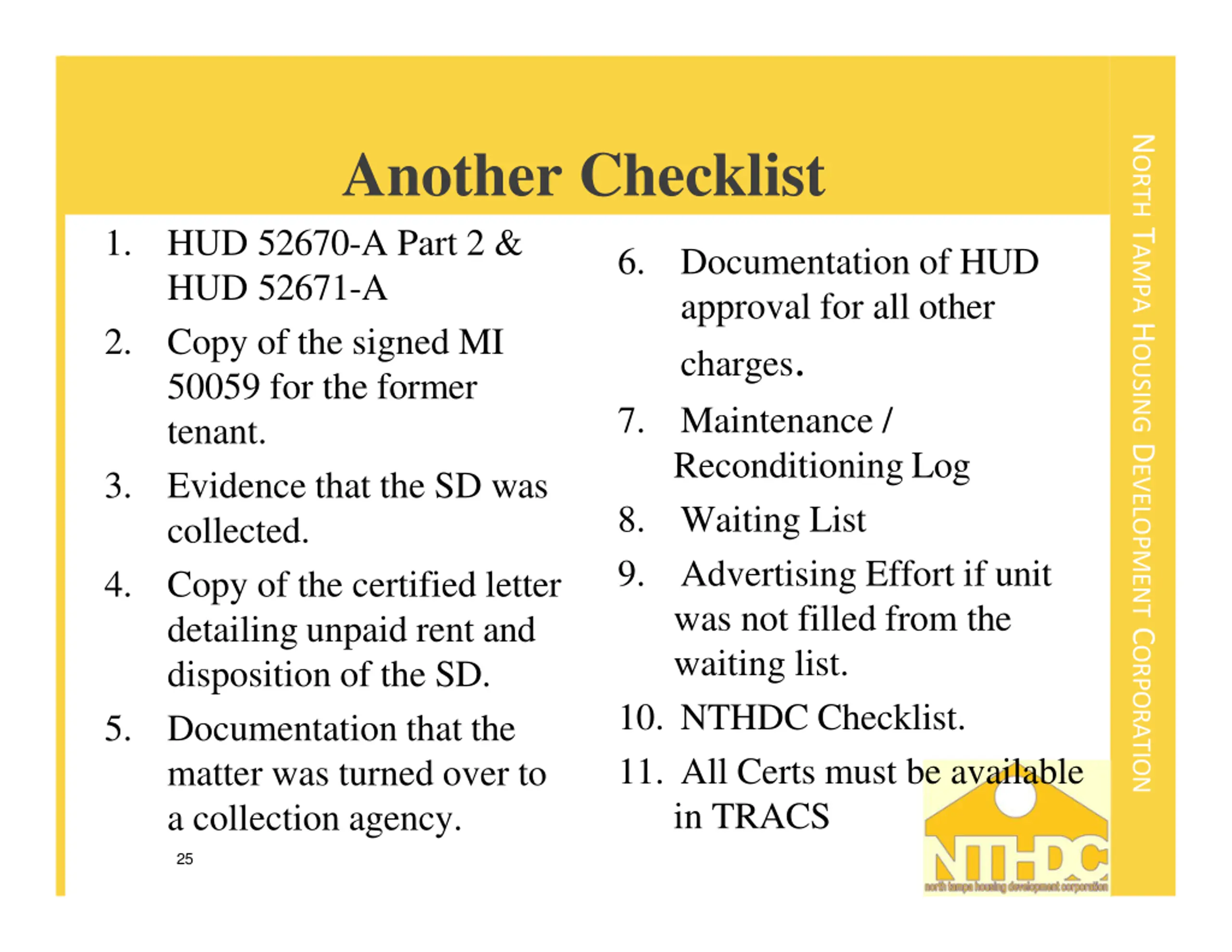 NORTH TAMPA HOUSING DEVELOPMENT CORPORATION Another Checklist HUD 52670-A Part 2 & HUD 52671-A Copy of the signed MI 50059 for the former tenant. Evidence that the SD was collected. Copy of the certified letter detailing unpaid rent and disposition of the SD. Documentation that the matter was turned over to a collection agency. 1. 6. Documentation of HUD approval for all other charges. Maintenance / Reconditioning Log Waiting List Advertising Effort if unit was not filled from the waiting list. 10. NTHDC Checklist. 11. All Certs must be available in TRACS 2. 7. 3. 8. 9. 4. 5. 25