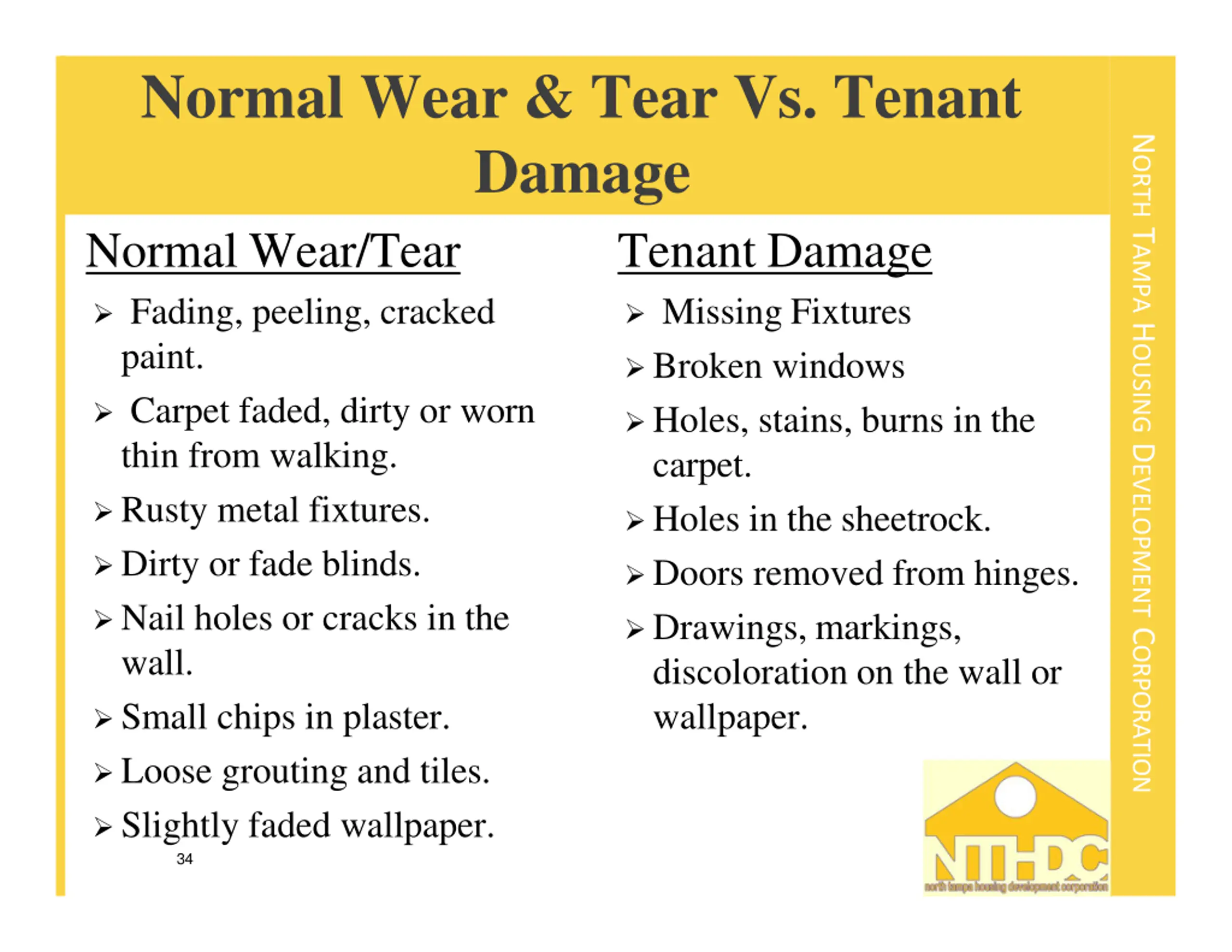 Normal Wear & Tear Vs. Tenant Damage Normal Wear/Tear Fading, peeling, cracked paint. Carpet faded, dirty or worn thin from walking. Rusty metal fixtures. Dirty or fade blinds. Nail holes or cracks in the wall. Small chips in plaster. Loose grouting and tiles. Slightly faded wallpaper. NORTH TAMPA HOUSING DEVELOPMENT CORPORATION Tenant Damage Missing Fixtures Broken windows Holes, stains, burns in the carpet. Holes in the sheetrock. Doors removed from hinges. Drawings, markings, discoloration on the wall or wallpaper. 34