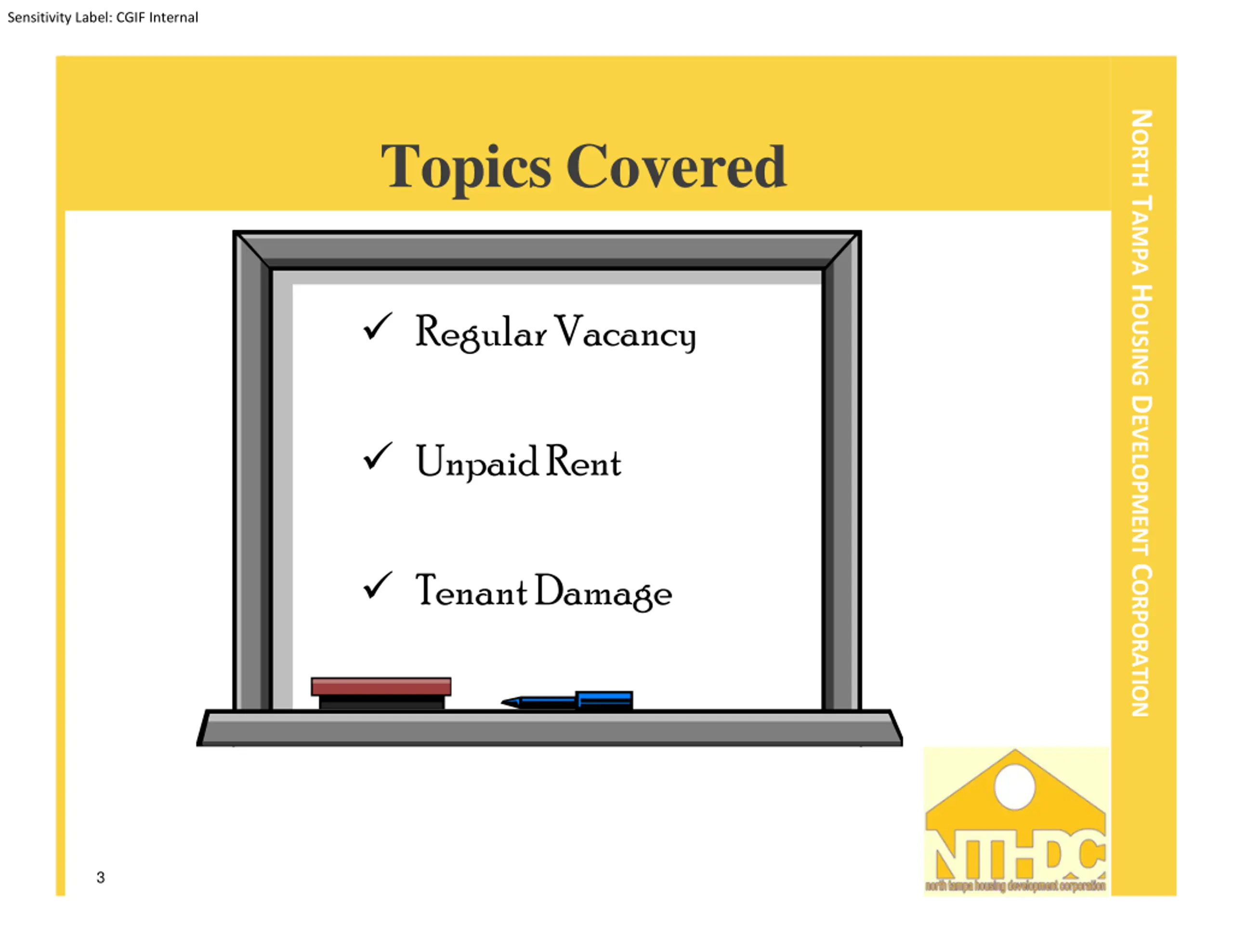 Sensitivity Label: CGIF Internal NORTH TAMPA HOUSING DEVELOPMENT CORPORATION TopicsCovered RegularVacancy UnpaidRent TenantDamage 3