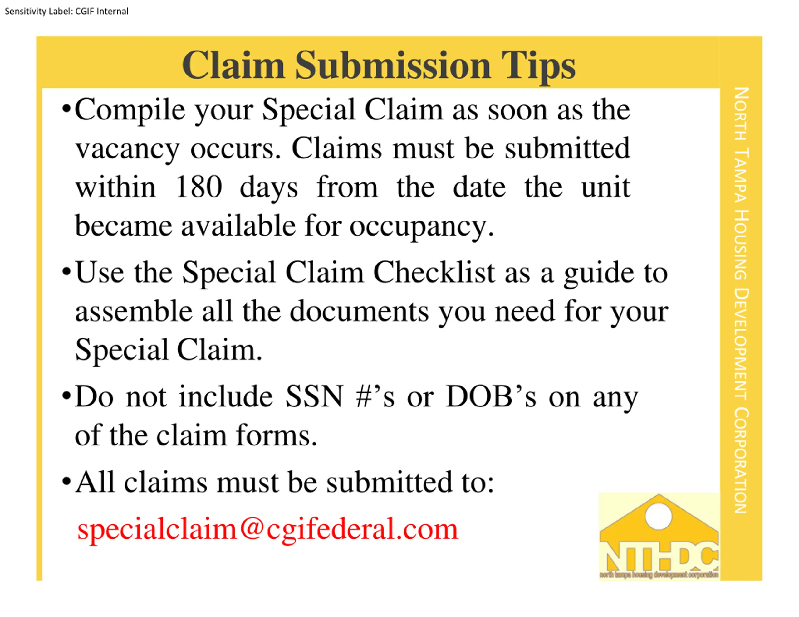 Sensitivity Label: CGIF Internal Claim Submission Tips Compile your Special Claim as soon as the vacancy occurs. Claims must be submitted within 180 days from the date the unit became available for occupancy. Use the Special Claim Checklist as a guide to assemble all the documents you need for your Special Claim. Do not include SSN # s or DOB s on any of the claim forms. All claims must be submitted to: specialclaim@cgifederal.com NORTH TAMPA HOUSING DEVELOPMENT CORPORATION