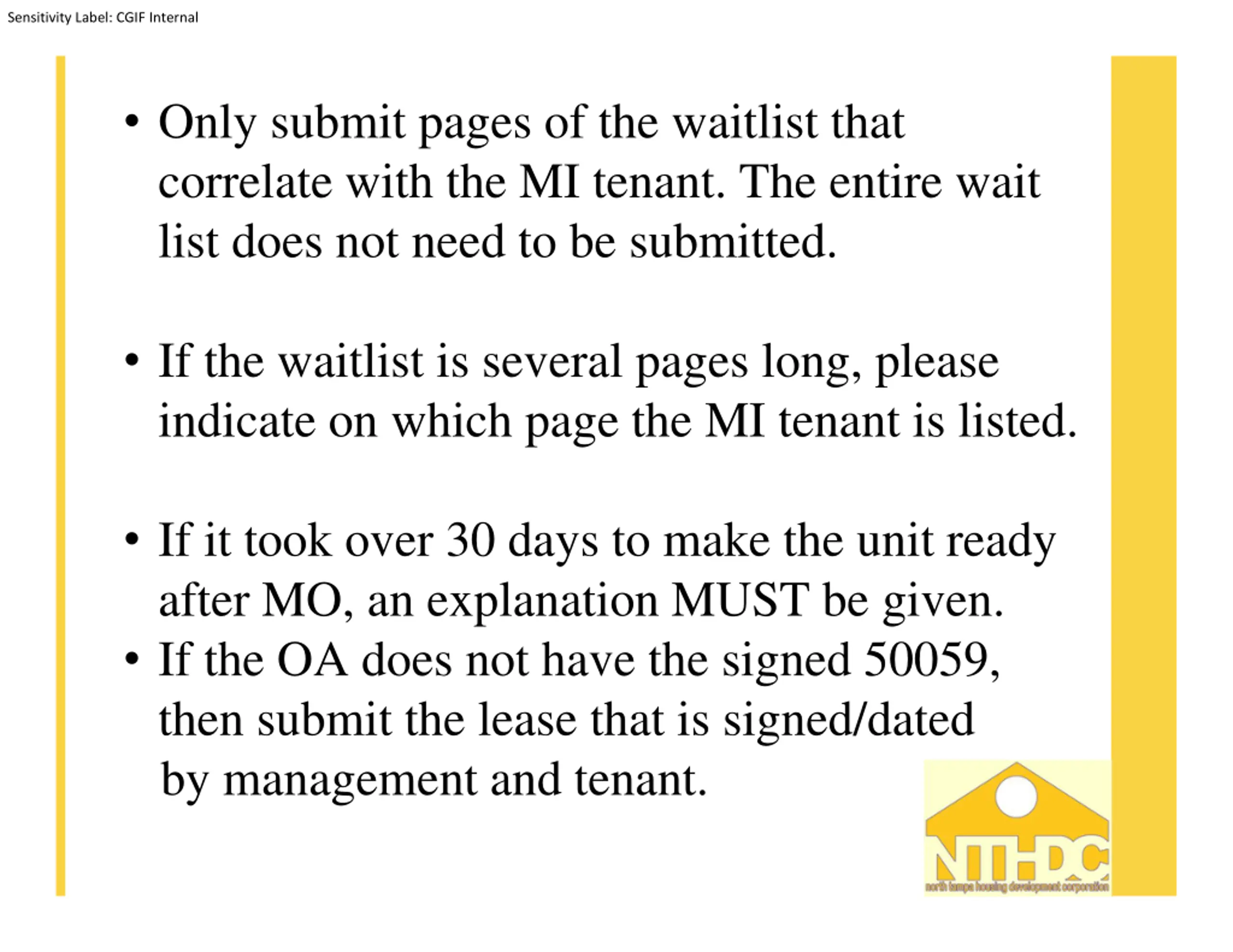 Sensitivity Label: CGIF Internal Only submit pages of the waitlist that correlate with the MI tenant. The entire wait list does not need to be submitted. If the waitlist is several pages long, please indicate on which page the MI tenant is listed. If it took over 30 days to make the unit ready after MO, an explanation MUST be given. If the OA does not have the signed 50059, then submit the lease that is signed/dated by management and tenant.