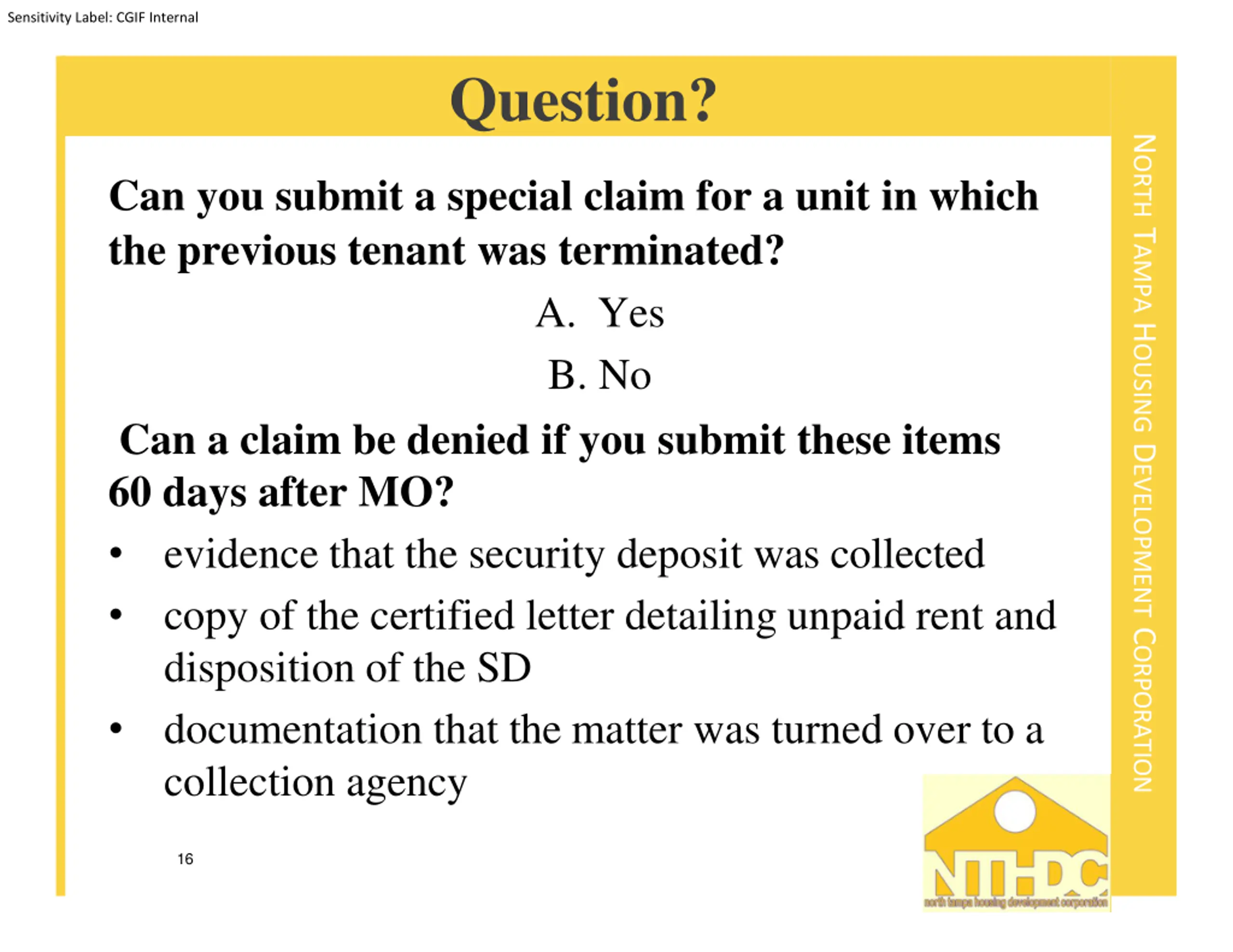 Sensitivity Label: CGIF Internal Question? NORTH TAMPA HOUSING DEVELOPMENT CORPORATION Can you submit a special claim for a unit in which the previous tenant was terminated? A. Yes B. No Can a claim be denied if you submit these items 60 days after MO? evidence that the security deposit was collected copy of the certified letter detailing unpaid rent and disposition of the SD documentation that the matter was turned over to a collection agency 16