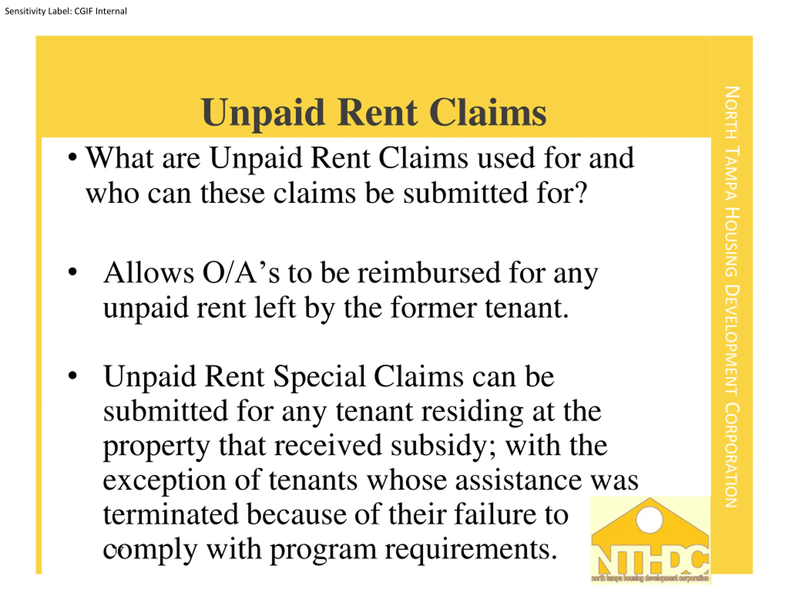 Sensitivity Label: CGIF Internal NORTH TAMPA HOUSING DEVELOPMENT CORPORATION Unpaid Rent Claims What are Unpaid Rent Claims used for and who can these claims be submitted for? Allows O/A s to be reimbursed for any unpaid rent left by the former tenant. Unpaid Rent Special Claims can be submitted for any tenant residing at the property that received subsidy; with the exception of tenants whose assistance was terminated because of their failure to comply with program requirements. 17
