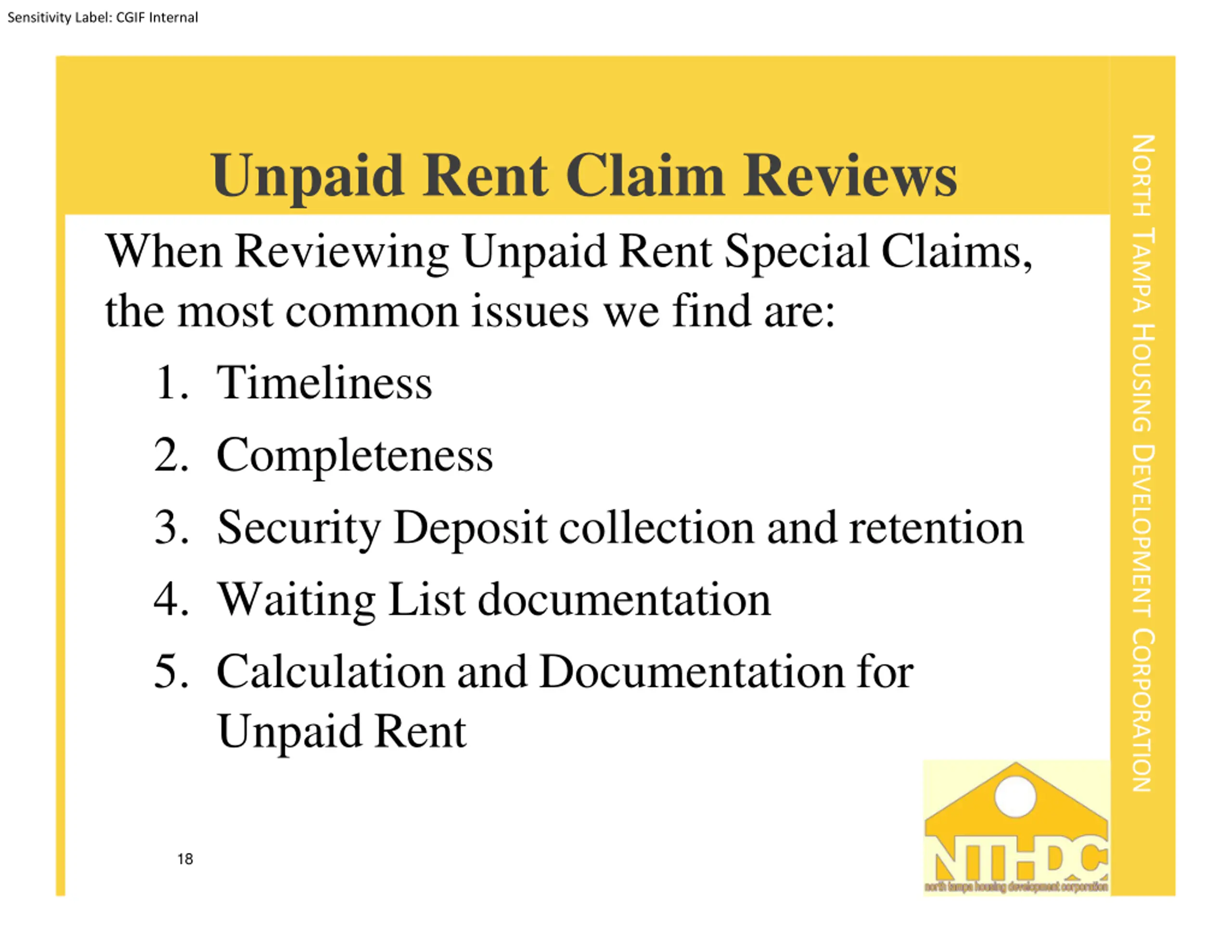 Sensitivity Label: CGIF Internal NORTH TAMPA HOUSING DEVELOPMENT CORPORATION Unpaid Rent Claim Reviews When Reviewing Unpaid Rent Special Claims, the most common issues we find are: 1. Timeliness 2. Completeness 3. Security Deposit collection and retention 4. Waiting List documentation 5. Calculation and Documentationfor Unpaid Rent 18
