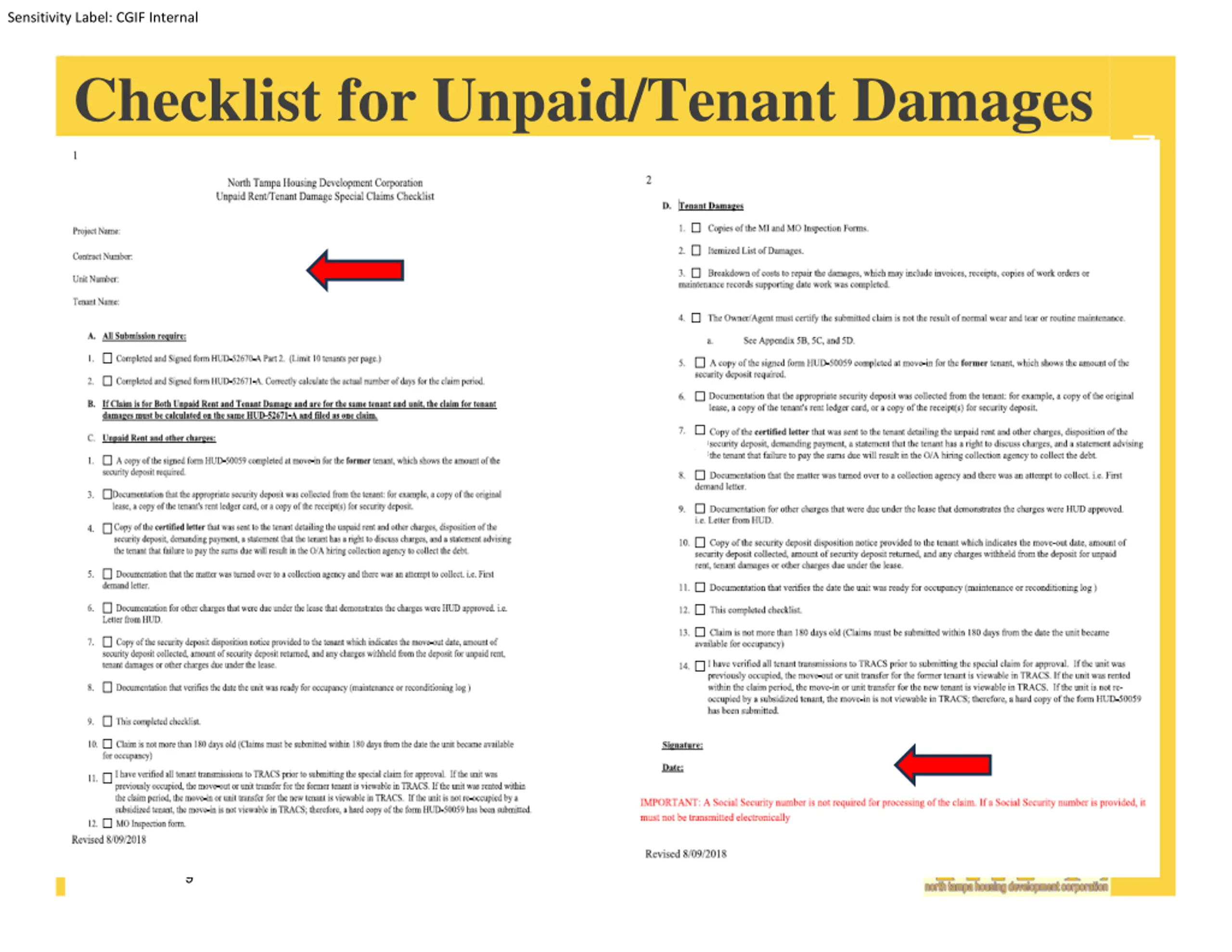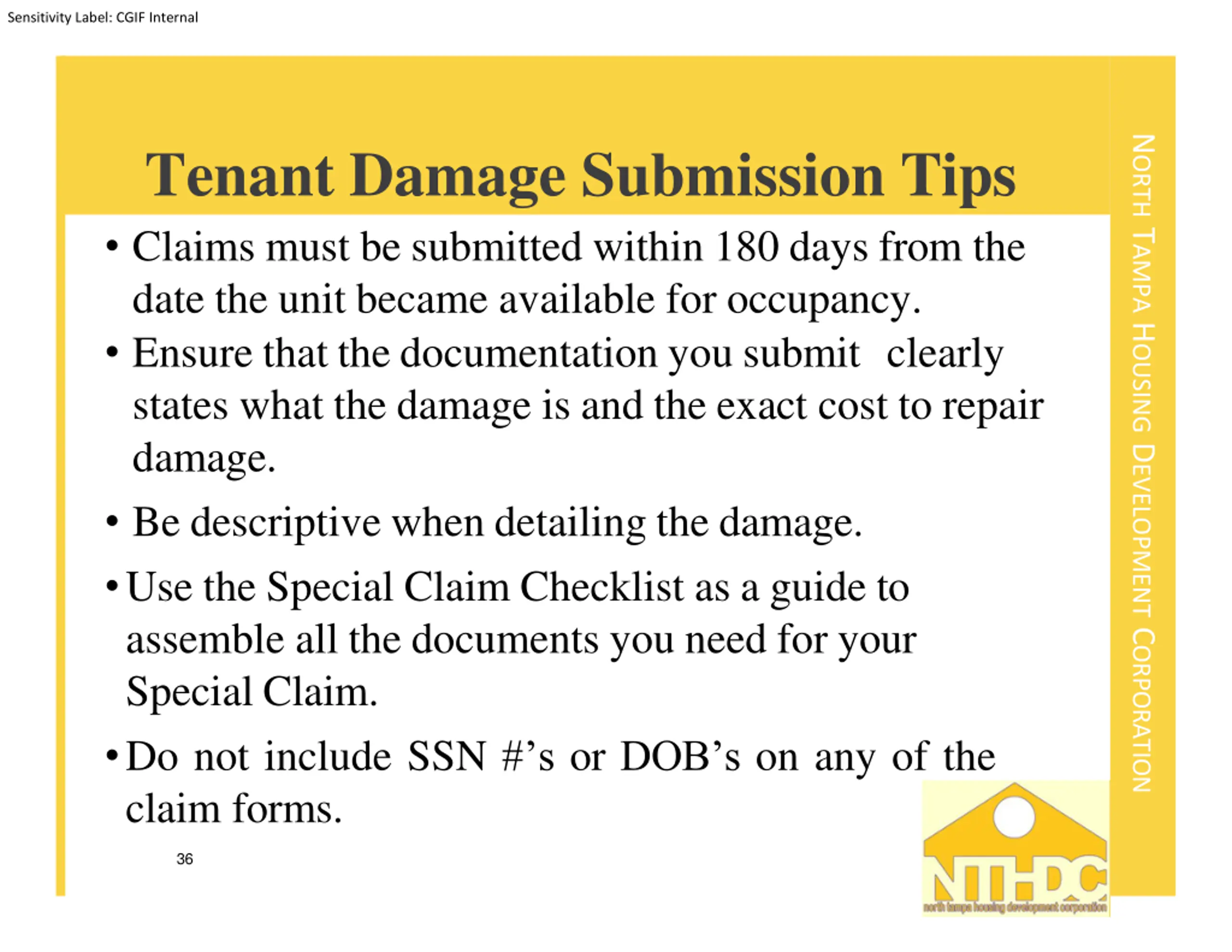 Sensitivity Label: CGIF Internal NORTH TAMPA HOUSING DEVELOPMENT CORPORATION Tenant Damage Submission Tips Claims must be submitted within 180 days from the date the unit became available for occupancy. Ensure that the documentation you submit clearly states what the damage is and the exact cost to repair damage. Be descriptive when detailing the damage. Use the Special Claim Checklist as a guide to assemble all the documents you need for your Special Claim. Do not include SSN # s or DOB s on any of the claim forms. 36