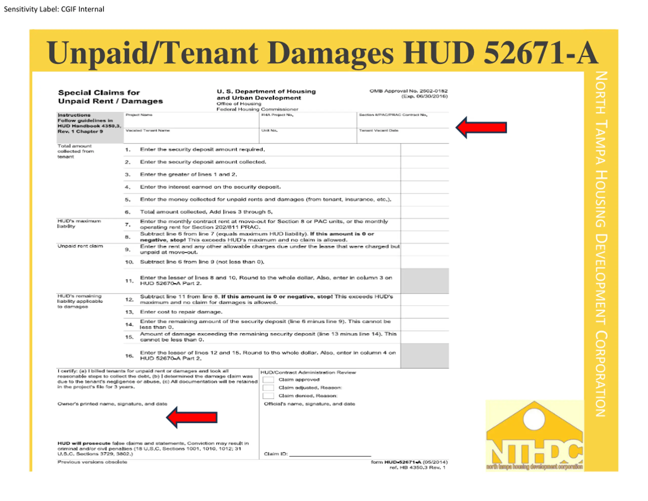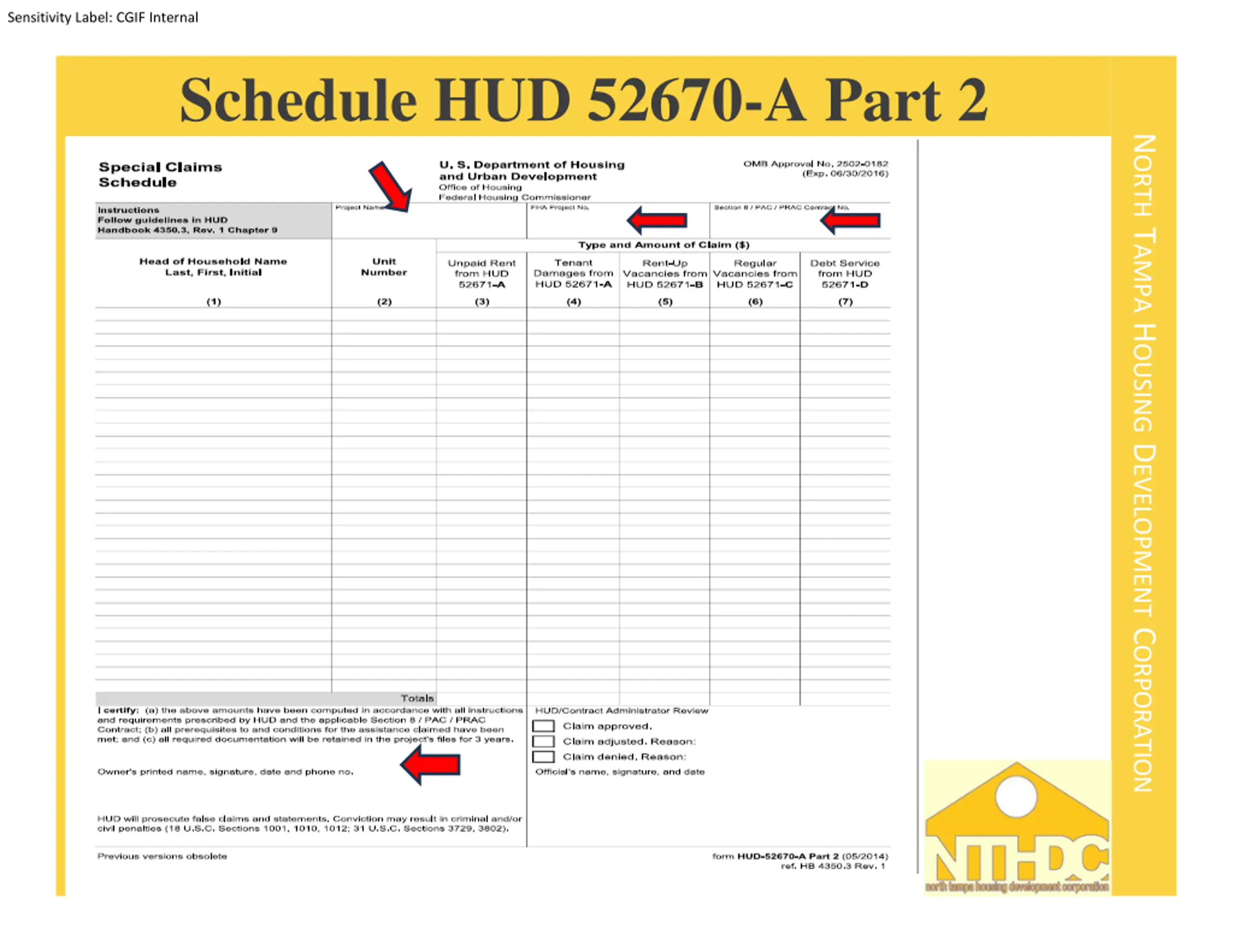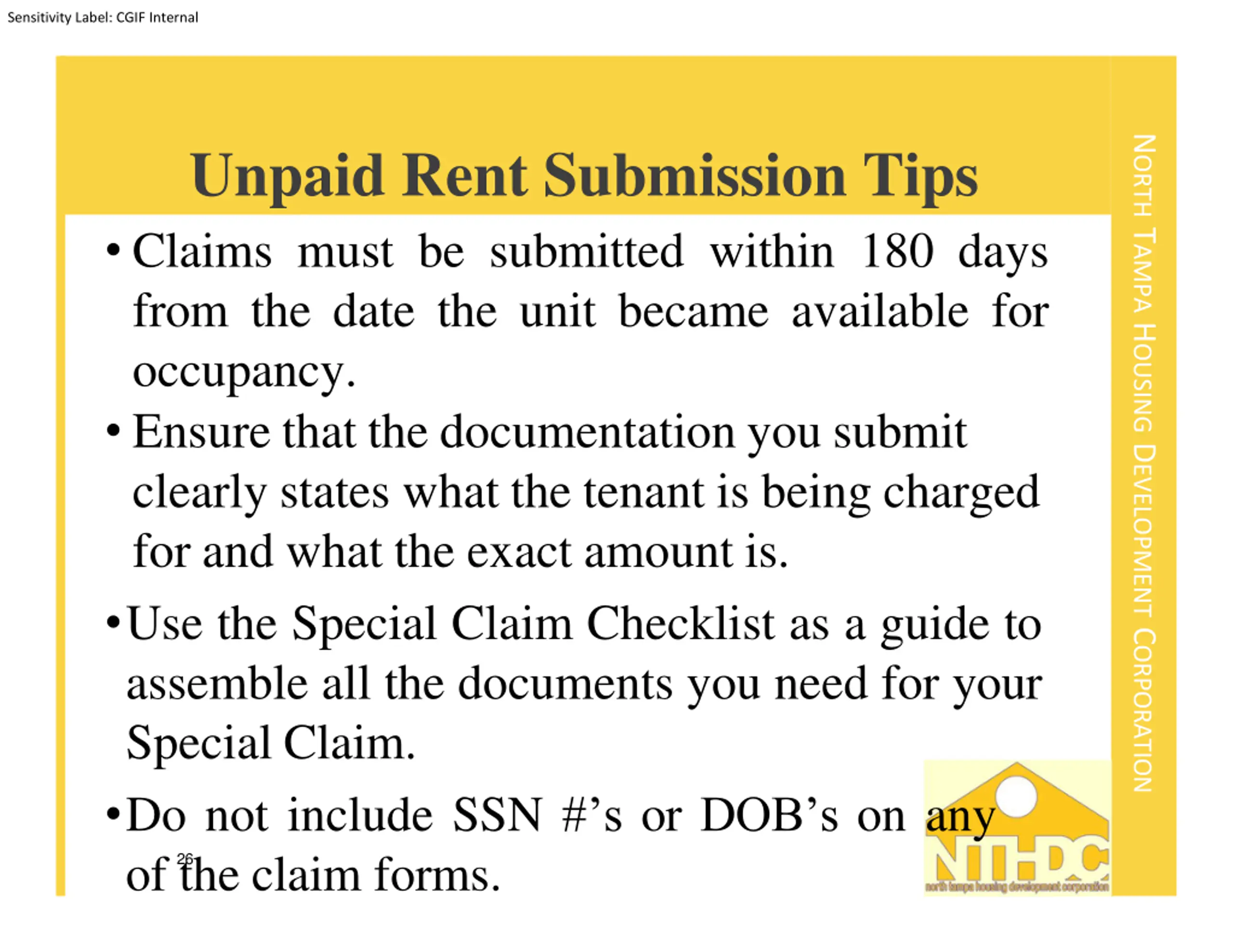 Sensitivity Label: CGIF Internal NORTH TAMPA HOUSING DEVELOPMENT CORPORATION Unpaid Rent Submission Tips Claims must be submitted within 180 days from the date the unit became available for occupancy. Ensure that the documentation you submit clearly states what the tenant is being charged for and what the exact amount is. Use the Special Claim Checklist as a guide to assemble all the documents you need for your Special Claim. Do not include SSN # s or DOB s on any of the claim forms. 26