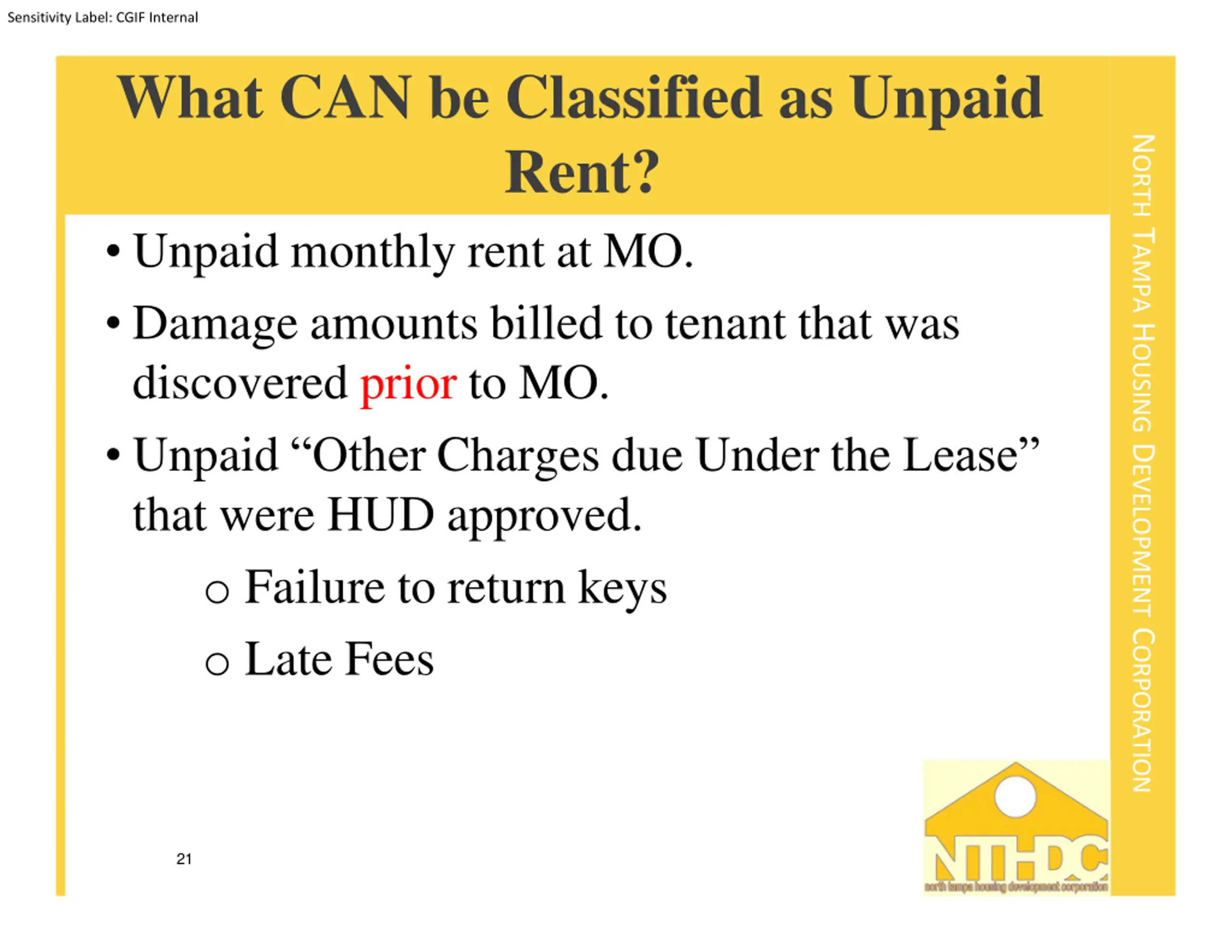 Sensitivity Label: CGIF Internal What CAN be Classified as Unpaid Rent? Unpaid monthly rent at MO. Damage amounts billed to tenant that was discovered prior to MO. Unpaid Other Charges due Under the Lease that were HUD approved. o Failure to return keys o Late Fees NORTH TAMPA HOUSING DEVELOPMENT CORPORATION 21