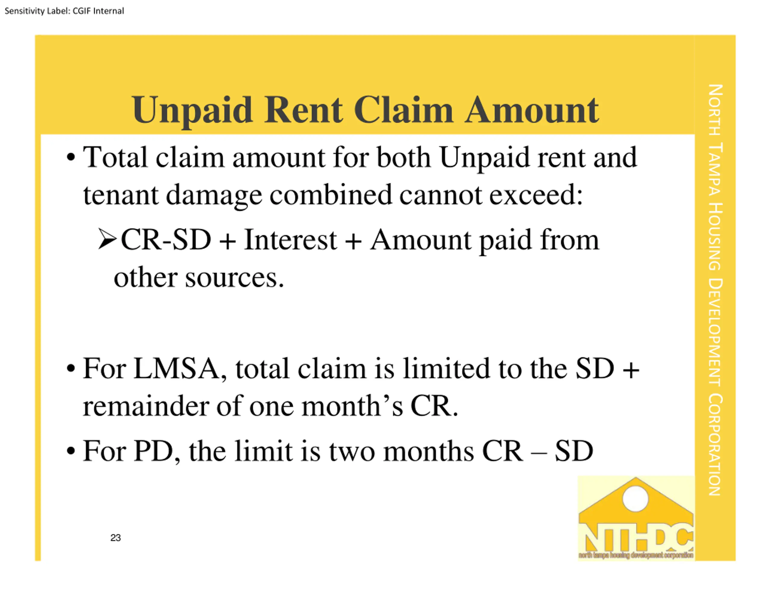 Sensitivity Label: CGIF Internal NORTH TAMPA HOUSING DEVELOPMENT CORPORATION Unpaid Rent Claim Amount Total claim amount for both Unpaid rent and tenant damage combined cannot exceed: CR-SD + Interest + Amount paid from other sources. For LMSA, total claim is limited to the SD + remainder of one month s CR. For PD, the limit is two months CR SD 23